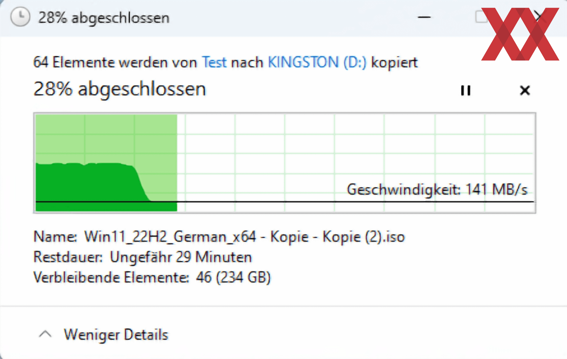 Nach Erreichen von ca. 70 GB fiel die Transferrate von 713 MB/s auf 141MB/s ab. Vergleicht man dieses Ergebnis z.B. mit der Corsair EX100U mit 2 TB, so hat diese noch deutlich früher gedrosselt und wurde während dieses Transfers bereits 81°C warm. Vergleicht man die maximale Transferrate mit der, der Samsung portable SSD T7 Shield, 2 TB, so verfügt die XS1000 über eine um 20 % höhere Rate beim Kopieren.