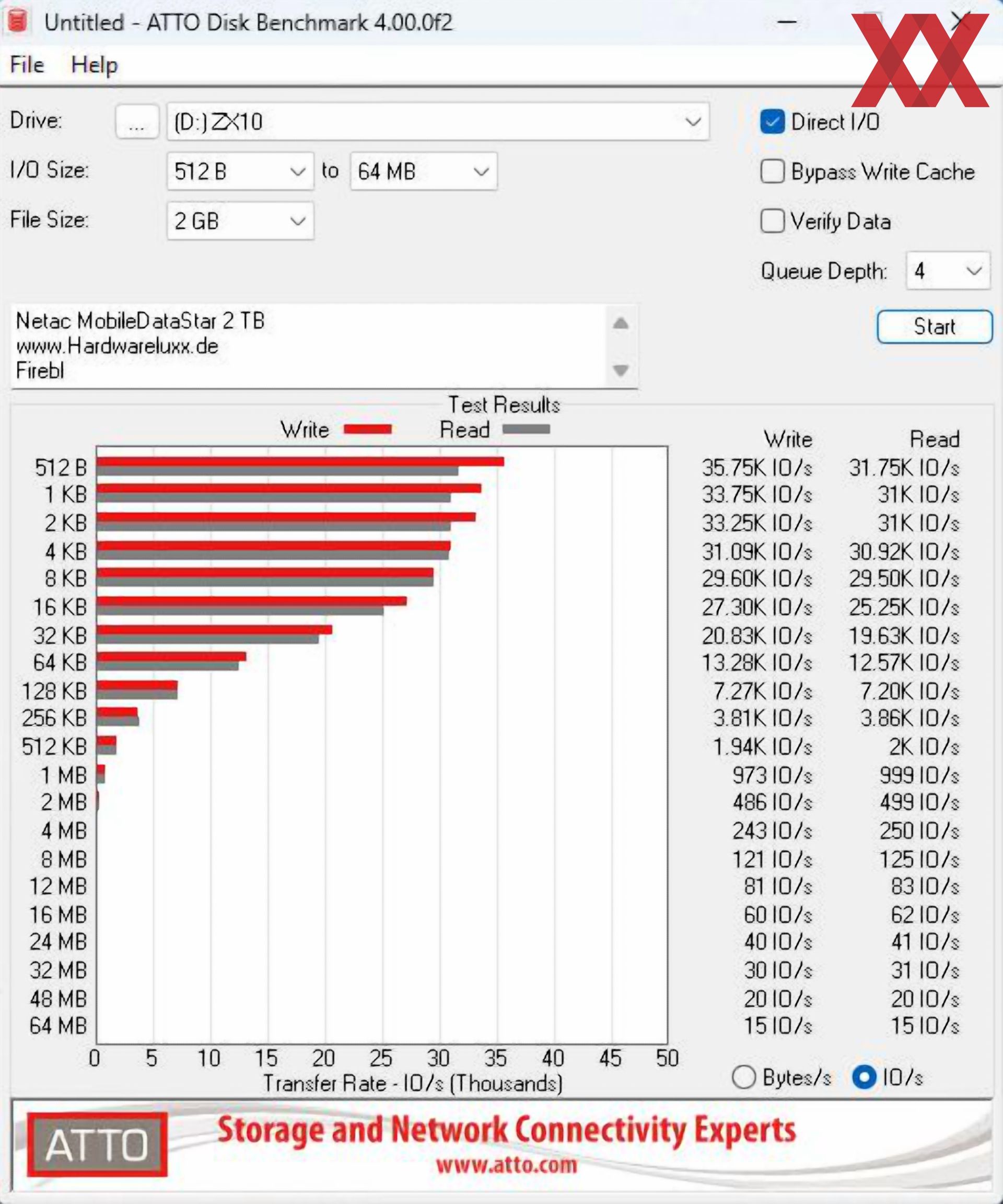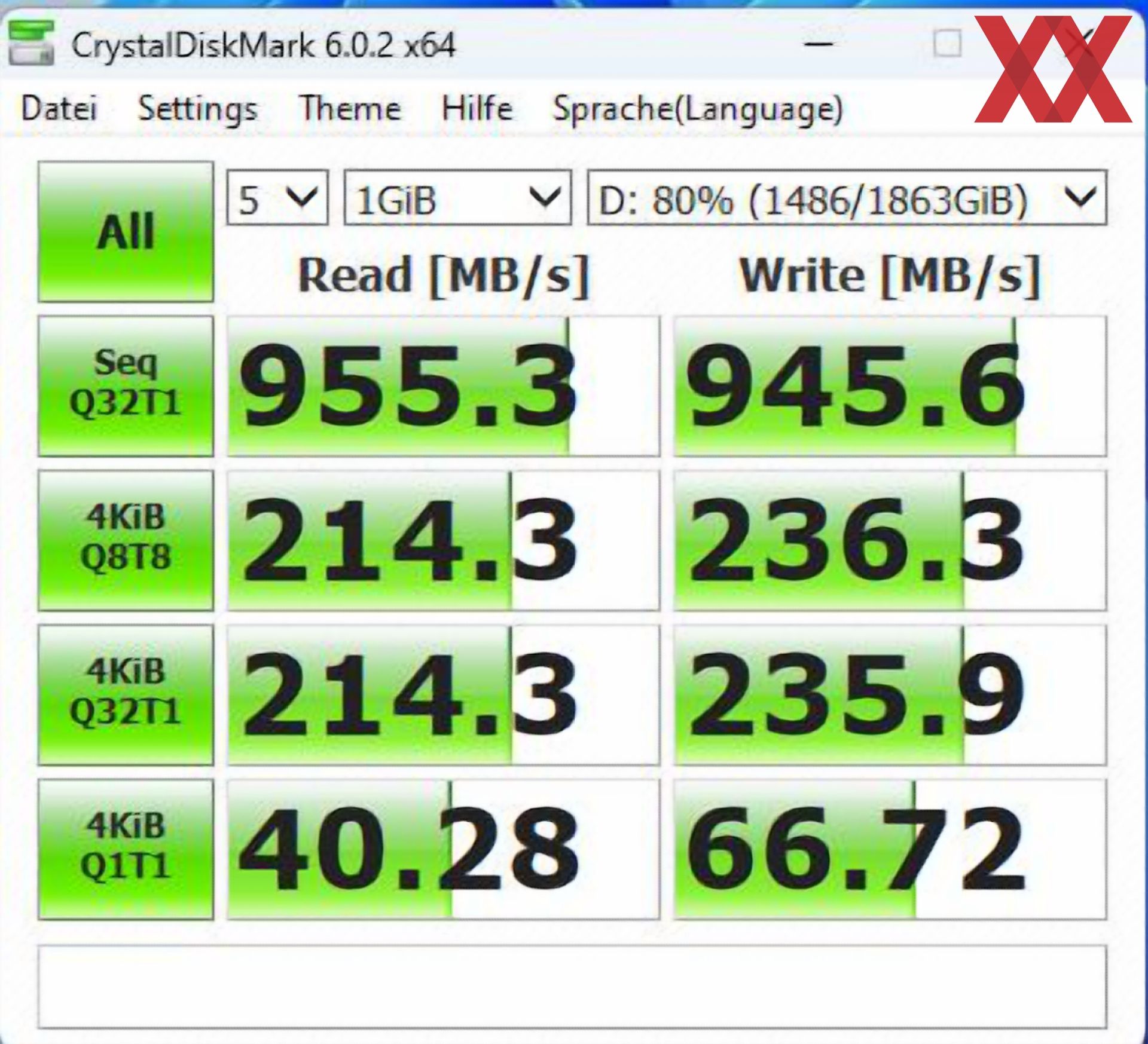 Die Ergebnisse fallen wie zu erwarten für eine externe SSD mit USB-3.2-Gen-2-Anschluss aus, mehr als 1.100 MB/s maximale Transferrate sind hier nicht zu erzielen. In Crystal Disk Mark 8 erreichen wir beim Lesen exakt die Werksangebe. Vergleicht man die Ergebnisse mit der Kingston XS1000 Portable SSD mit 2 TB, so fallen die Ergebnisse der ZX10 leicht besser aus. Im Vergleich mit der Kombination aus dem Cooler Master Oracle Air NVMe M.2 SSD Enclosure und der WD Blue SN570-SSD bleibt die Netac ZX10 etwas hinter den Ergebnisse zurück.