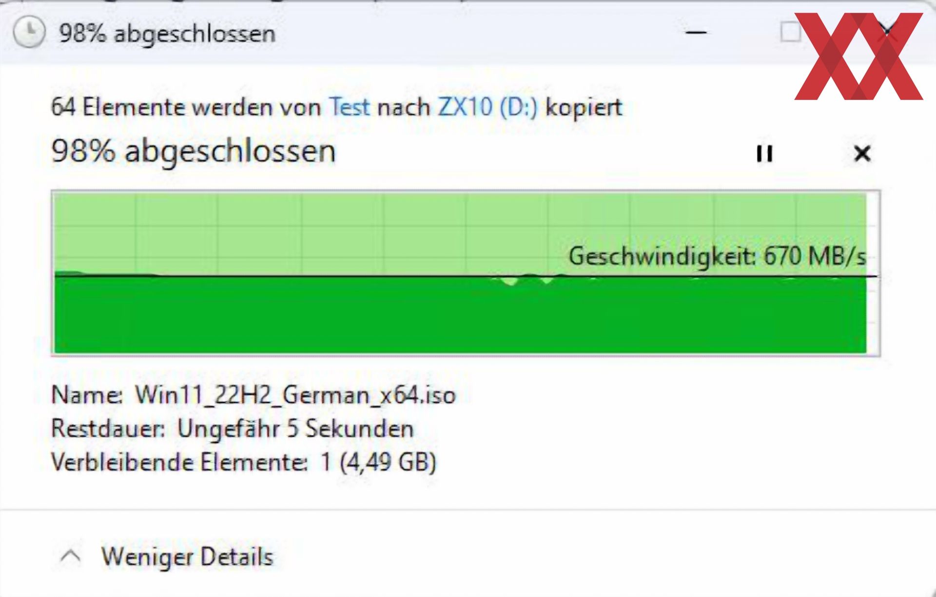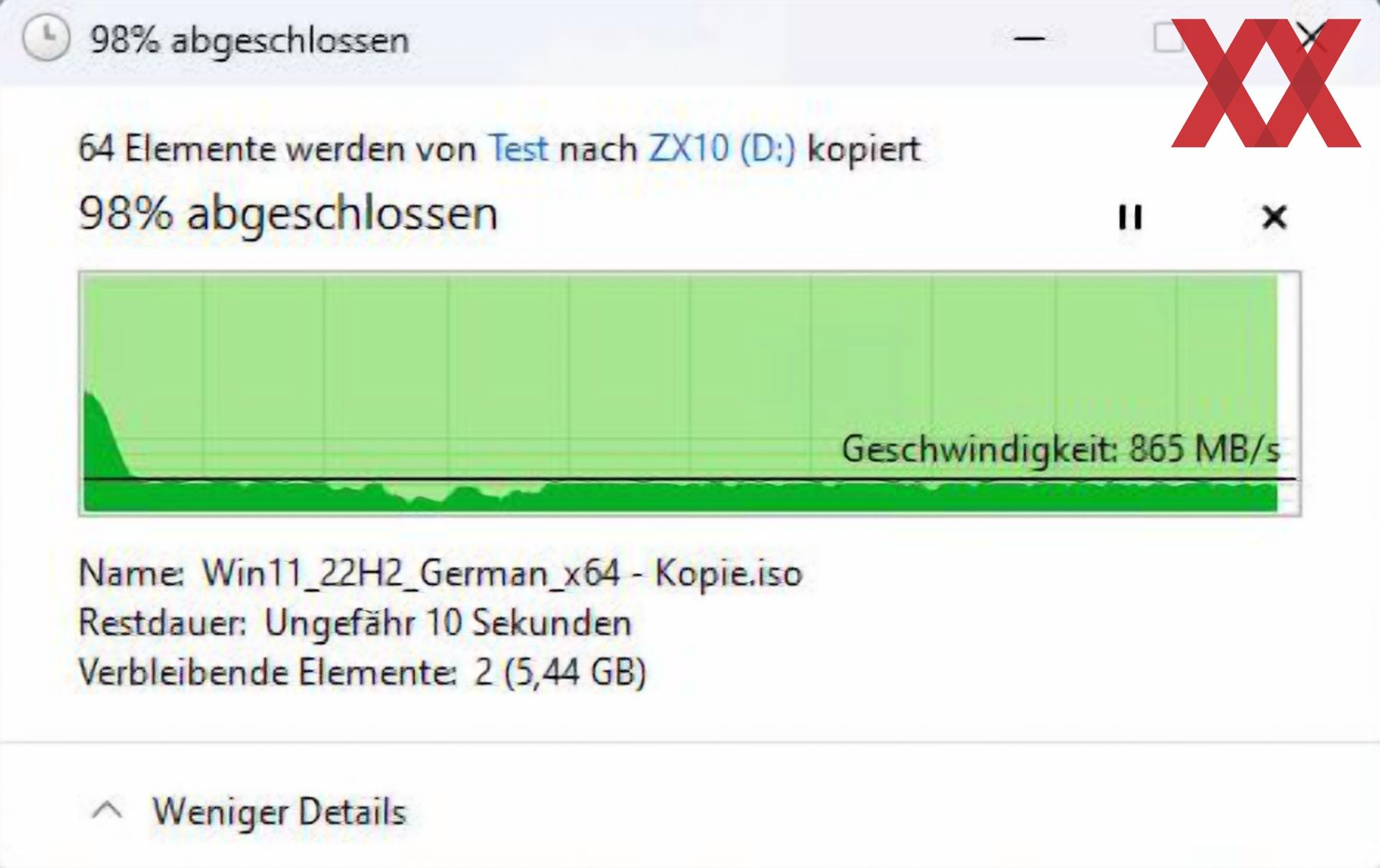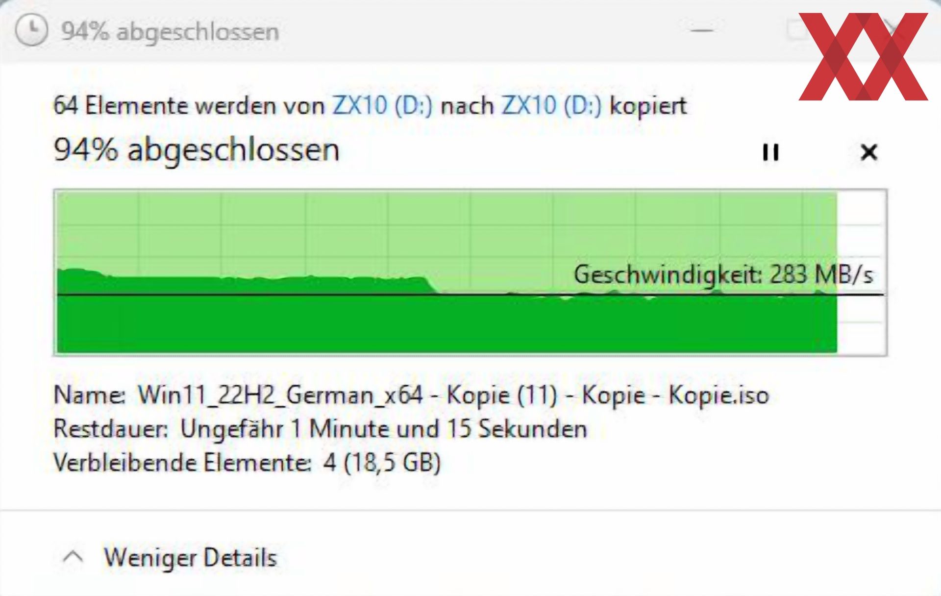 Die Leistung der externen SSD liegt bei 80-%-Füllgrad noch auf einem hohen Niveau, etwa 10 % unterhalb der leeren SSD. Wie auf dem letzten Bild der 80-%-Galerie zu sehen ist, beginnt die ZX10 zu drosseln, wenn Daten innerhalb der SSD vervielfältigt werden. nach ca. 70 GB sinkt die Kopierrate von 400 MB/s auf 280 MB/s.