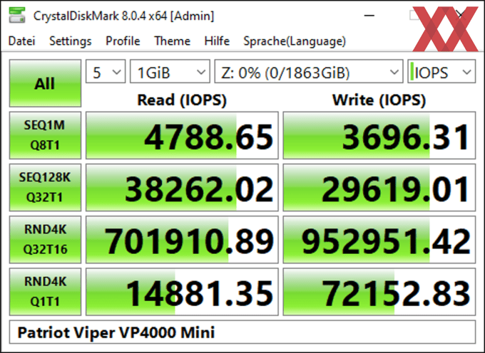 Im AS SSD Benchmark bietet die Patriot Viper VP4000 Mini auffällig gute Werte. Wir sehen besonders im 4K-Bereich Ergebnisse, die selbst aktuelle HighEnd-Modelle übertrumpfen und auch beispielsweise die Micron 2400 als naheliegendste Konkurrentin unseres Klassements weit hinter sich lässt. Realistisch sind die Werte daher mit Vorsicht zu genießen, wie auch der CrystalDiskMark bestätigt. Im AS SSD Benchmark waren zuletzt einige HMB-Modelle mit Phison-Controller (zu) schnell, was durchaus darauf schließen lässt, dass hier im RAM etwas gepuffert wird und daher die Übertragungsraten verfälscht werden.