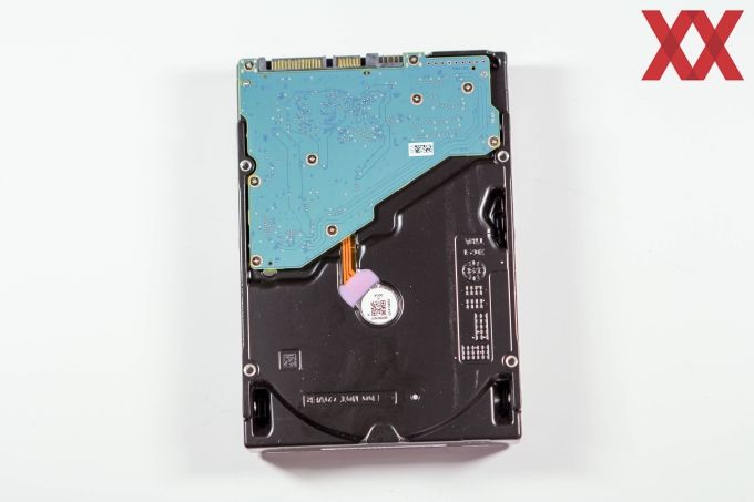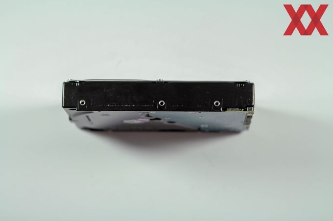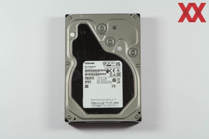 Die Oberseite der MG10D mit 8 TB. Trotz neuer Technologie ist auf den ersten Blick erkennbar, dass es sich nicht um eine Festplatte mit Helium-Füllung handelt. Im direkten Vergleich mit der MG06 hat sich das Gehäuse nur in der Größe des spiegelnden Bereichs verändert, welcher beim Vorgänger zwar gleichgroß, aber zweigeteilt war.