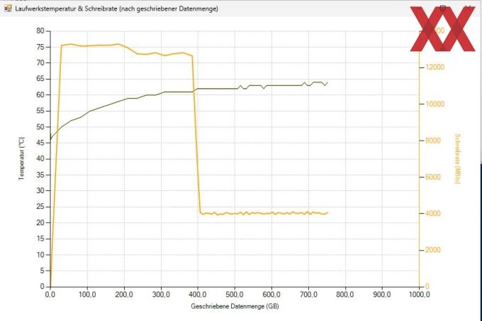 Mit 400 GB Schreiben bei höchster Geschwindigkeit ist die Crucial T710 mit 2 TB und 2 GB DRAM-Cache im normalen Bereich unterwegs. Im Vergleich zur Kingston Renegade Fury G5 (4 TB), mit doppeltem DRAM-Cache und 1.350 GB Schreiben bis zur Drosselung fällt der Wert geringer aus. Positiv gegenüber der Kingston: Mit unserem Versuchsaufbau und dem Standardkühler des Test-Mainboards kommt die Crucial T710 in der 2-TB-Ausführung nicht in den Temperatur-Drossel-Bereich. Im Gegensatz zur Kingston arbeitet sie mit doppelter Geschwindigkeit weiter.