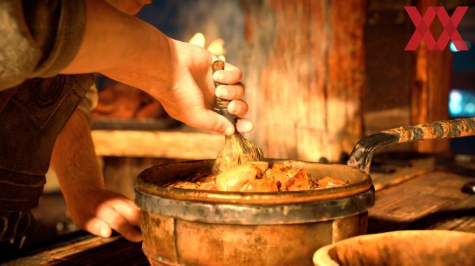Neben Upgrades, für welche wir Fell und dergleichen benötigen, erhalten wir so auch die Option zu kochen. Sobald Aloy auf den Koch Milduf getroffen ist, erhält sie von ihm eine Quest, bei der es auf die Jagd geht. Danach kann man ihm alle Sorten Fleisch und dergleichen bringen, um sich Buff-Food abzuholen. Der Food-Porn-Faktor ist hier nicht so hoch wie bei Dragon’s Dogma 2, aber dennoch vorhanden.