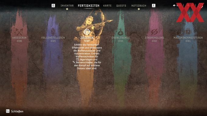 Aber mit der ersten Stufe eines Werkzeugs ist meist noch nicht Schluss. So können fast alle Werkzeuge und Waffen mehrfach aufgewertet werden, wenn man die entsprechenden Materialien hat. Daneben findet sich im Menü natürlich auch ein Skill-Tree, mit welchem man Aloy selbst verbessern kann. In vier Kategorien unterteilt, können so Nahkampf, Fernkampf, Überleben und Maschinenkentniss aufgewertet werden. Ab dem Start der eigentlichen Story hat man auch mehrere Optionen zur Auswahl im Gespräch. Je nach Wahl haben diese Einfluss auf die Charakterentwicklung Aloys und ihr Verhältnis zu anderen Personen in der Welt.