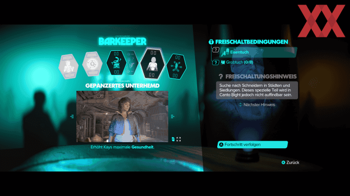 An Werkbänken und in verschiedenen Shops können alle möglichen Werkzeuge, Kleidung, der Gleiter und schließlich sogar Kays Schiff aufgewertet und umgebaut werden. Dafür sind verschiedene Materialien und immer auch eine gewisse Menge Credits notwendig. Kay selbst hat an sich keinen Skill-Tree. Dafür lernen wir im Laufe des Spiels bestimmte Charaktere kennen, deren Fähigkeiten wir uns aneignen können. Im Menü werden dann Aufträge angezeigt, die es zu erfüllen gibt. Sind sie abgeschlossen, lernt Kay einen neuen Trick. So kann man sich nach und nach wichtige Fähigkeiten entsperren, die auch bei Erkunden der Welt hilfreich sind.