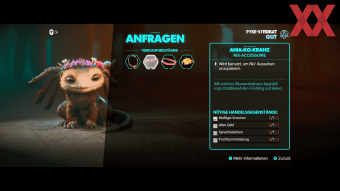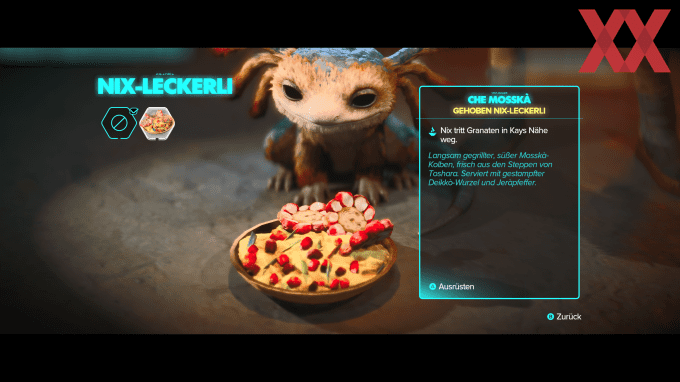 Über das Inventar kann Nix optisch angepasst und mit kleinen Accessoires ausgestattet werden. In den großen Städten gibt es manchmal Essensstände zu finden, an denen ein leider viel zu langes Minispiel mit etlichen Quick-Time-Events absolviert werden muss. Die Szenen sind zwar durchaus lustig und zeigen die Beziehung zwischen Kay und Nix, aber das Minispiel ist zu viel des Guten. Hat man es geschafft, kann man die Leckerei für Nix wie einen Ausrüstungsgegenstand equippen und ihm dadurch einen bestimmten Bonus verleihen.