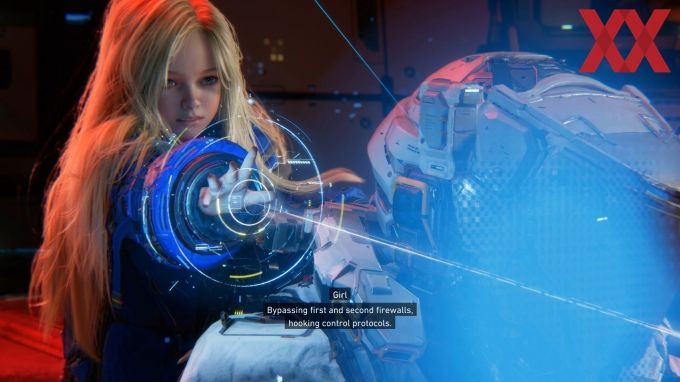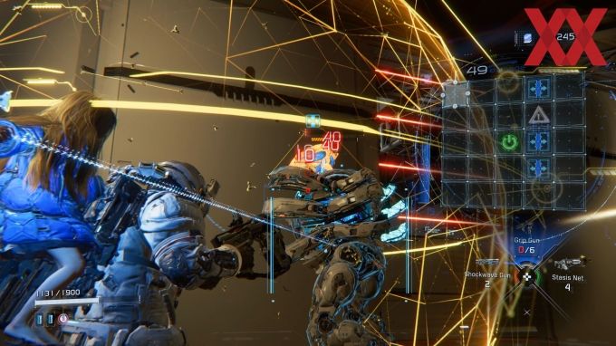 Es handelt sich um einen Androiden, der über einzigartige Fähigkeiten verfügt. Sobald sie schnell auf unseren Rücken klettert, können wir unsere mechanischen Kontrahenten hacken, während wir auf sie feuern. Hier finden wir eine sehr interessante Mechanik. Während sich das Spiel eigentlich wie ein klassischer Shooter spielt, müssen wir während der Kämpfe ein Hacking-Minispiel abschließen. Bewegen wir den Cursor korrekt über das Schachbrett ins Ziel und nehmen dabei noch Bonus-Felder mit, verursachen wir Bonus-Schaden und Stunnen unseren Gegner gegebenenfalls auch noch.