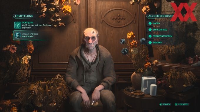 In dem vom Krieg zerstörten Land können wir mit allen Zivilisten sprechen, die wir antreffen. Dabei haben wir die Auswahl zwischen Fragen zur Ermittlung auf der linken und Allgemeinwissen auf der rechten Seite. Die Ermittlung treibt die Story voran und wir schalten neue Fragen im Laufe des Gesprächs frei, wenn unser Wissensstand wächst oder wir Quests für den NPC erfüllen. Das Allgemeinwissen hilft uns beim Verständnis der Welt und der agierenden Kriegsparteien. Mit den Informationen aus diesen Fragen füllen wir den Glossar und blicken langsam durch die verwirrenden Zustände, die das Land erschüttern.