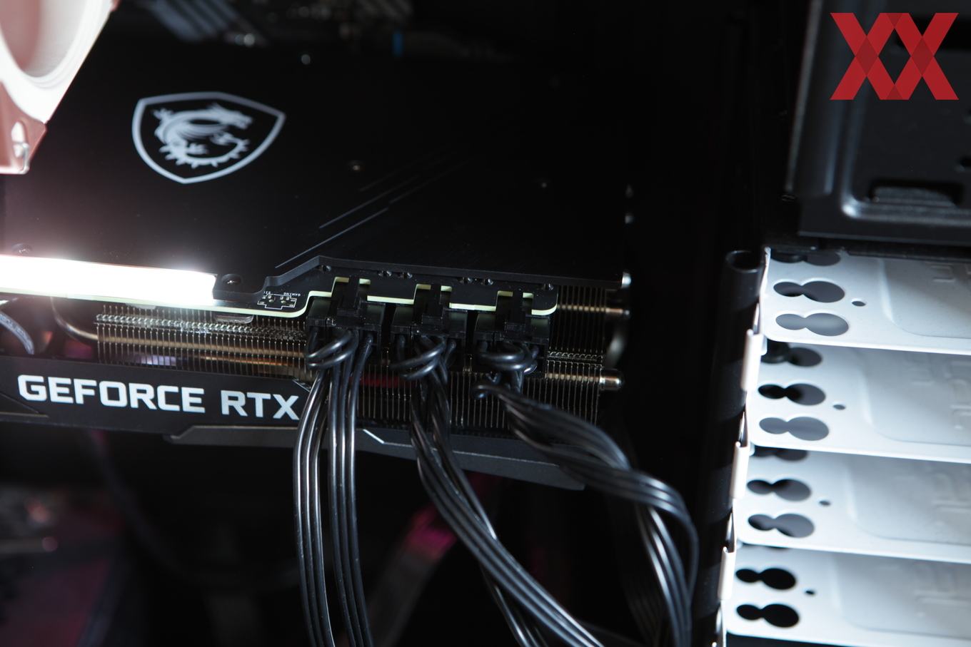 Ein Highlight ist vor allem das Kühlsystem. Hier gibt es auf einer Gesamtlänge von 320 mm und einer Bauhöhe von gleich drei Slots drei riesige Axiallüfter mit einem Durchmesser von bis zu 100 mm. Sie schalten sich erst ab einer Temperatur von etwa 60 °C hinzu und arbeiten darunter semi-passiv und damit völlig lautlos. Für die Stromversorgung müssen gleich zwei 8-Pin-PCI-Express-Stromstecker an den 3D-Beschleuniger gesteckt werden.