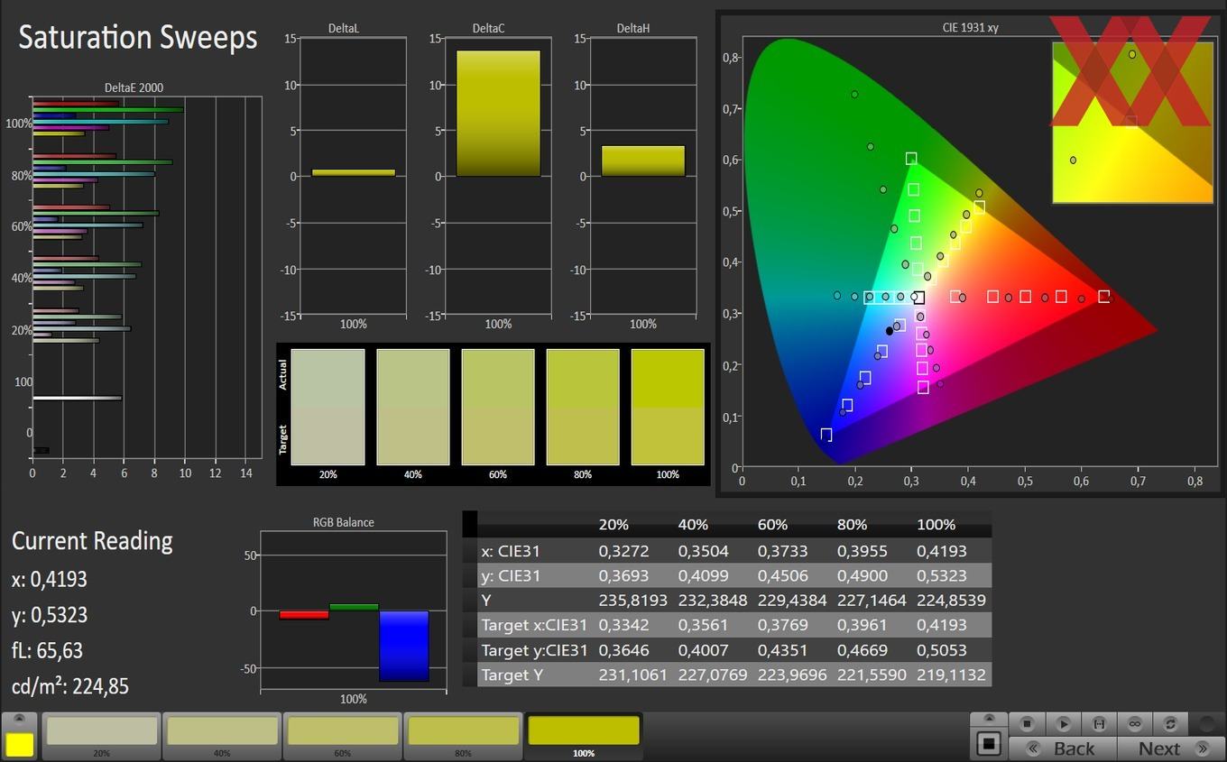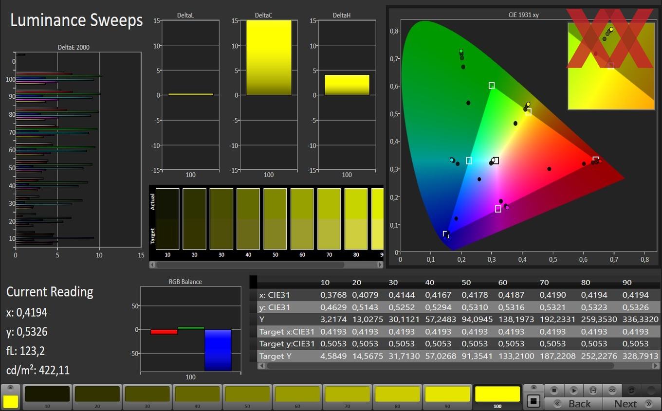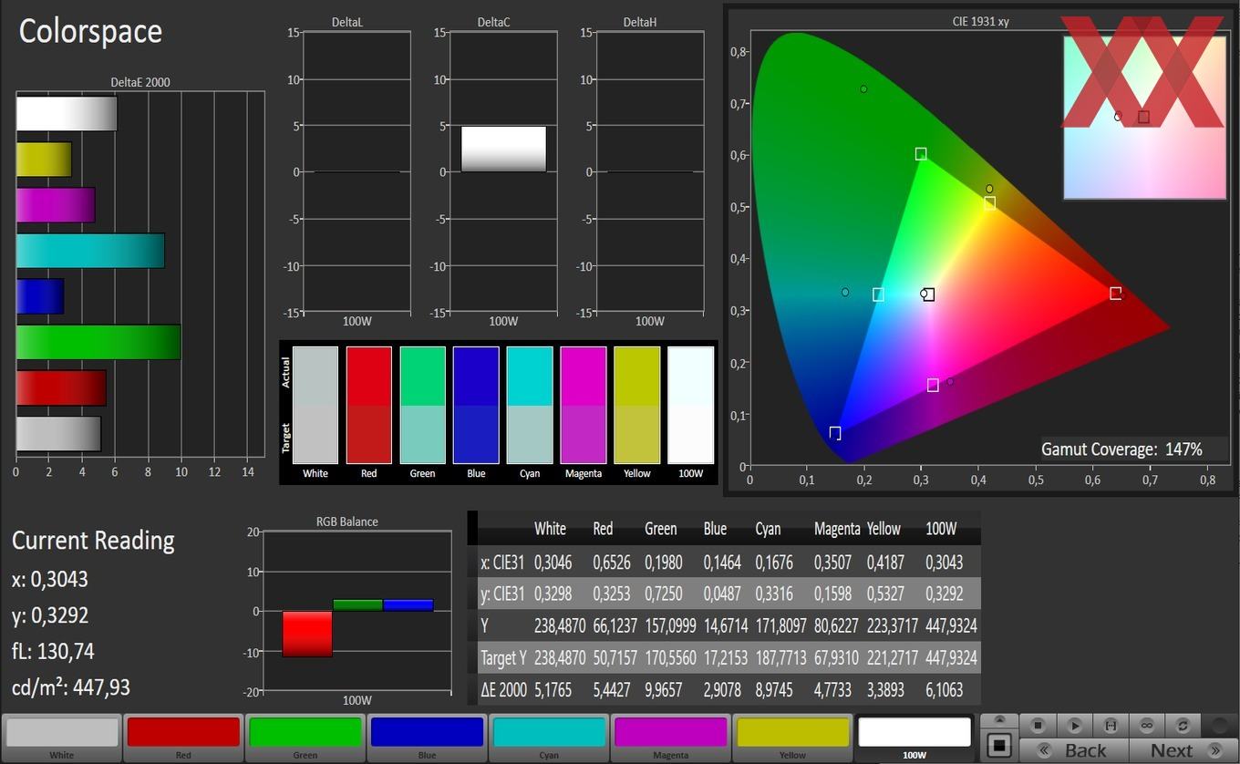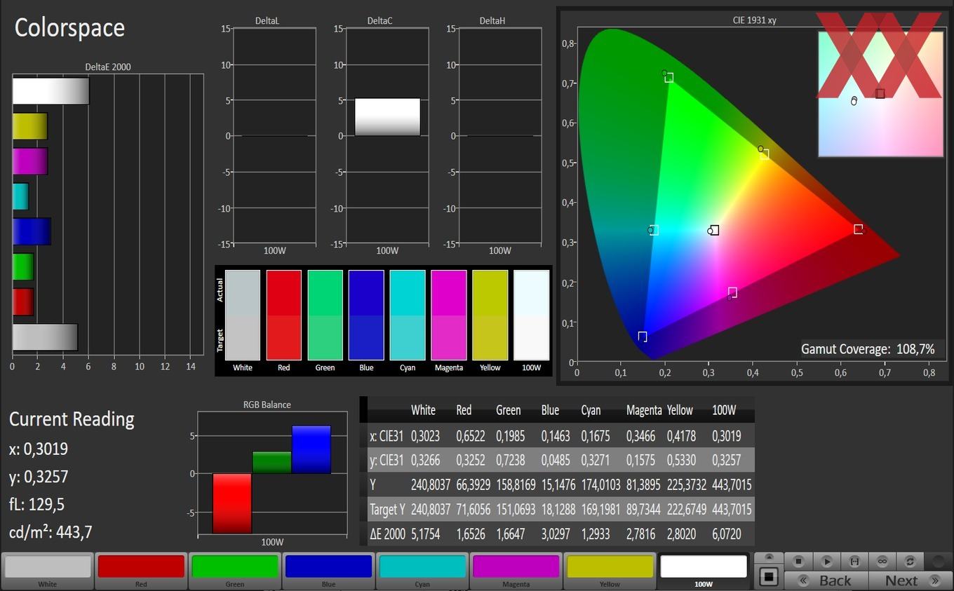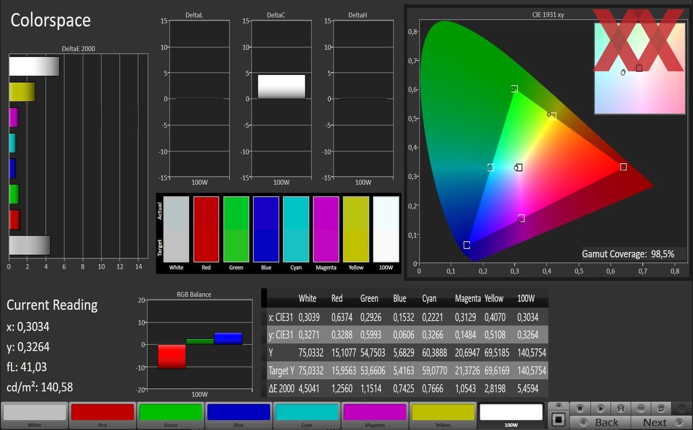 Da MSI auf ein Panel mit Quantum-Dot-Technik setzt, kann mit einer großen Farbraum-Abdeckung gepunktet werden, AdobeRGB wird beispielsweise vollständig abgedeckt. Wie so oft ist der Weißpunkt aber etwas zu kühl abgestimmt. In unseren Messungen konnte das Panel mit einer für SDR problemlos ausreichenden Helligkeit und einer hervorragenden Homogenität aufwarten.
