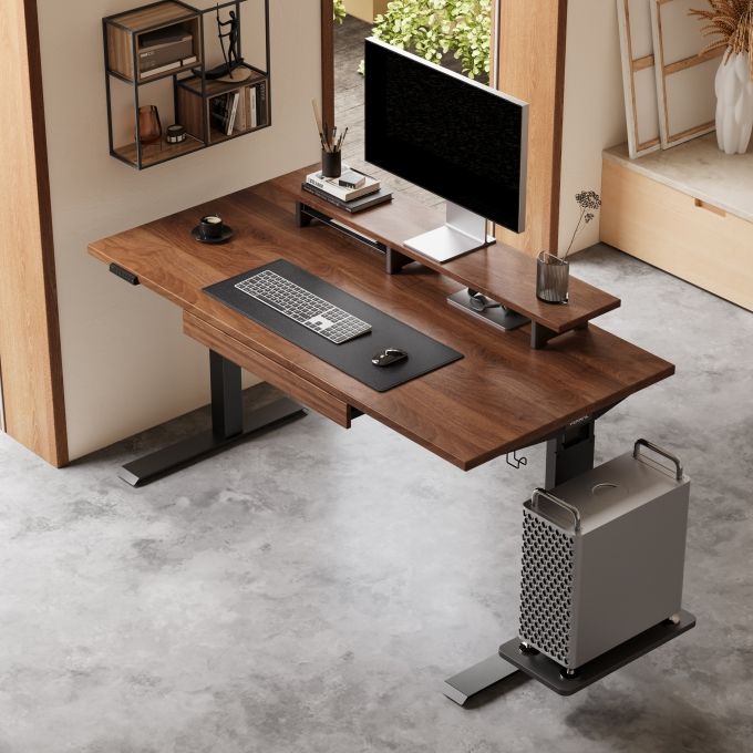 Das Gestell beim Executive-Schreibtisch ist von 58 bis 123 cm höhenverstellbar. Gleich drei Motoren kümmern sich darum, dass sich die Tischplatte um 4 cm pro Sekunde hinaus- und herabsenken lässt. Es lassen sich vier Höhen abspeichern, was eine schnelle und reproduzierbare Anpassung der Tischhöhe sicherstellt.
