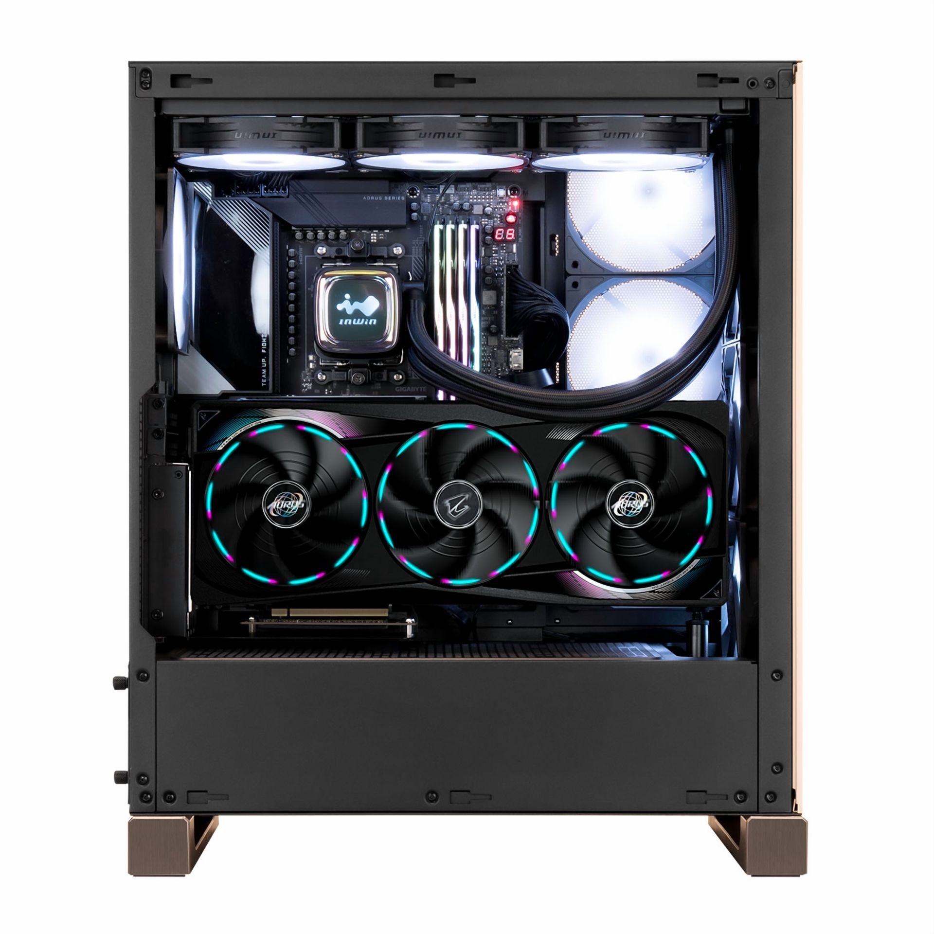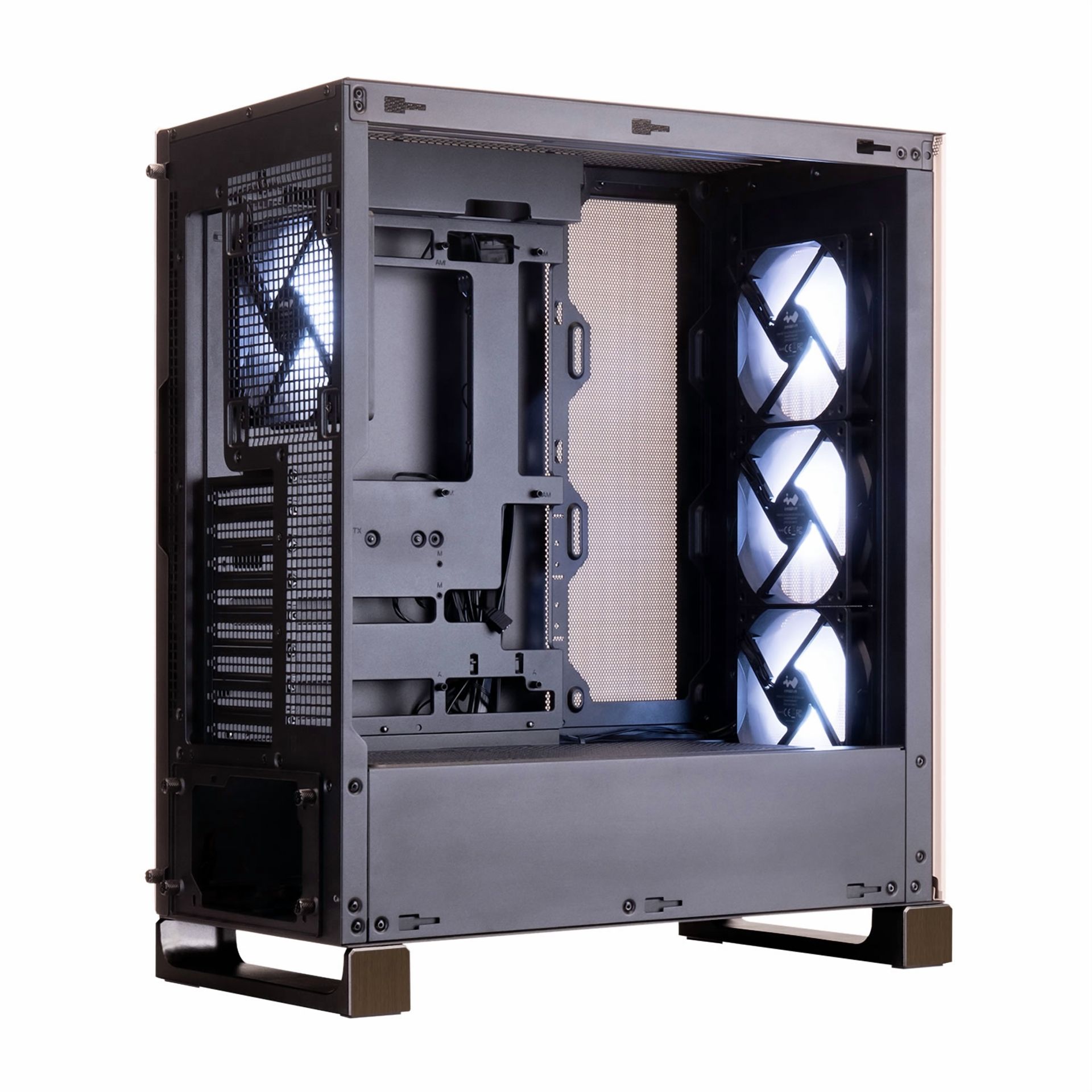 Für ein effizientes Kühlsystem bietet das InWin DLITE Platz für bis zu zehn Lüfter oder große Radiatoren – etwa 360-mm-Modelle im Deckel und an der Front. Über einen integrierten ARGB/PWM-Hub können die Lüfter bequemen angepasst werden. Außerdem kann die Beleuchtung direkt über eine Taste an der Front umgeschaltet werden. Damit der Innenraum frei von Staub bleibt, sitzen vor allen Lüftern magnetische Filter.