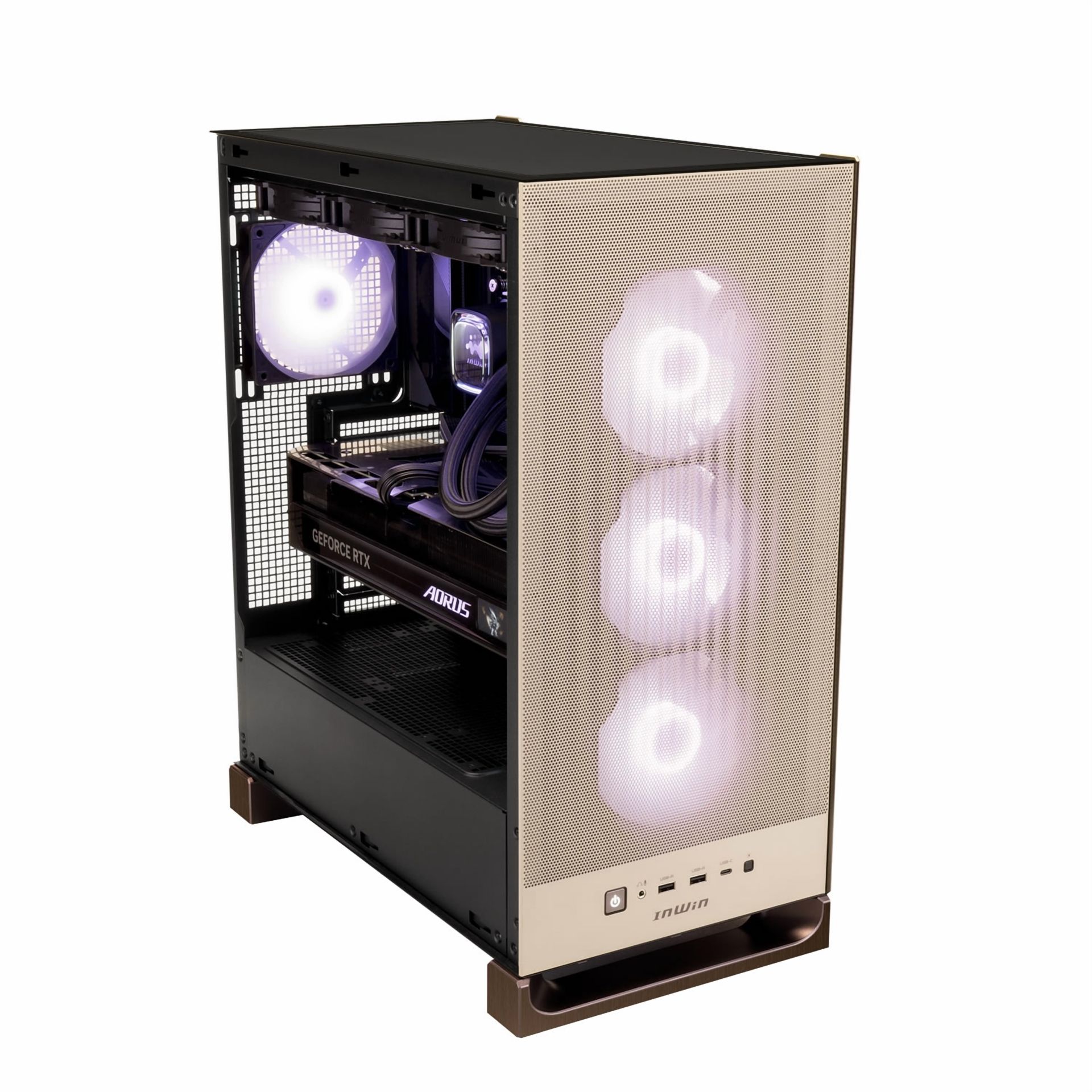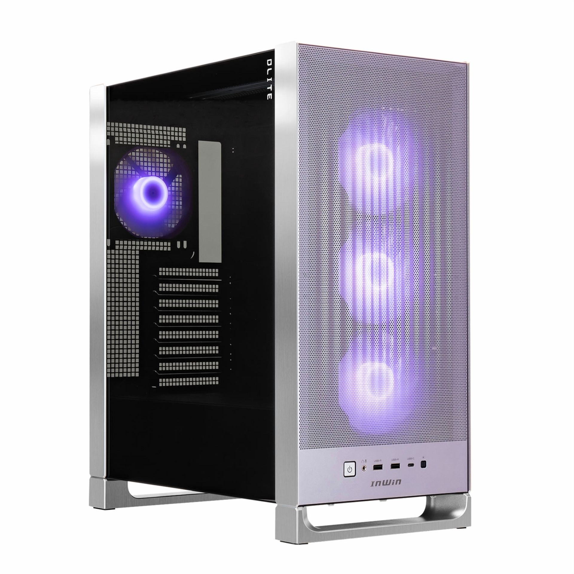 Der kompakte Midi-Tower InWin DLITE verbindet ein elegantes Design mit cleverer Technik. Das Gehäuse punktet mit einer hochwertigen Front im Aluminium-Look sowie einer Mesh-Struktur, wodurch eine moderne Metalloptik entsteht. Es stehen zwei Farbvarianten zur Wahl – Mocha-Brown und Lavender-Violet – die dafür sorgen, dass sich das DLITE gekonnt von der Masse abhebt. InWin spendiert dem Case ein Seitenteil aus Glas, sodass die Hardware optimal in Szene gesetzt werden kann. Passend dazu besteht die Möglichkeit, die Grafikkarte vertikal zu verbauen, was alle Blicke auf sich zieht.