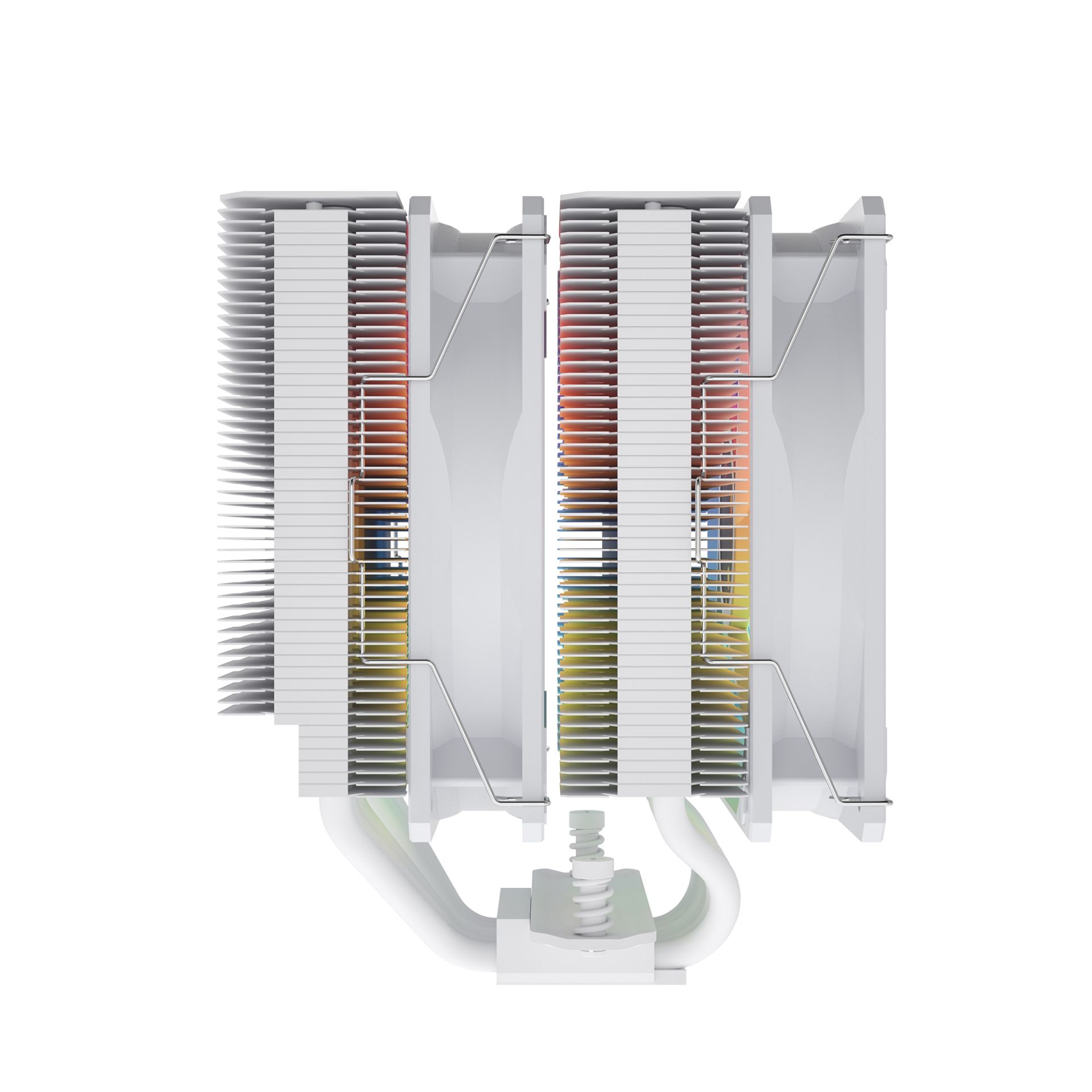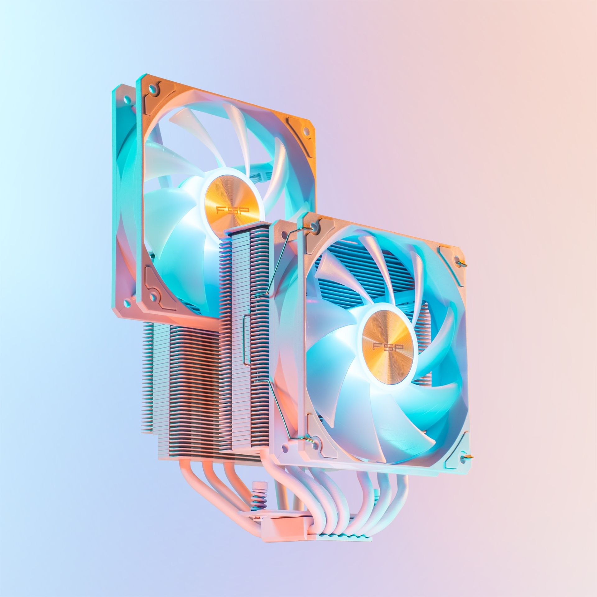 Gleichzeitig kommt natürlich die Kühlleistung nicht zu kurz: Sechs 6-mm-Hochleistungs-Kupfer-Heatpipes, eine Kupfer-Kühlplatte und eine Aluminiumkappe sorgen dafür, dass die Wärme schnell und effizient vom Prozessor abgeführt wird. Dazu passend gibt es ein duales 120-mm-Lüfter-Setup, das dank Flüssigkeits-Dynamik-Lager (FDB) nahezu lautlos arbeitet.