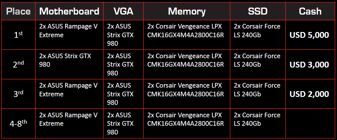 Am nächsten Wochenende startet in Moskau der ASUS Open Overclocking Cup 2014. Mit von der Partie sind auch Andreas Bock von den "BenchBros" und Daniel Schier alias "Dancop" - beides Mitglieder des Teams "Hardwareluxx Germany". Nun hat der Veranstalter die letzten Informationen gesammelt und stellt diese den Teilnehmern und der Presse zur Verfügung. Zeit sich die zur Verfügung gestellte Hardware, die Regeln und die weiteren Details zusammenzufassen. Neben ASUS sind auch Corsair und MicroXperts Sponsoren bzw. Organisatoren des diesjährigen Finales.