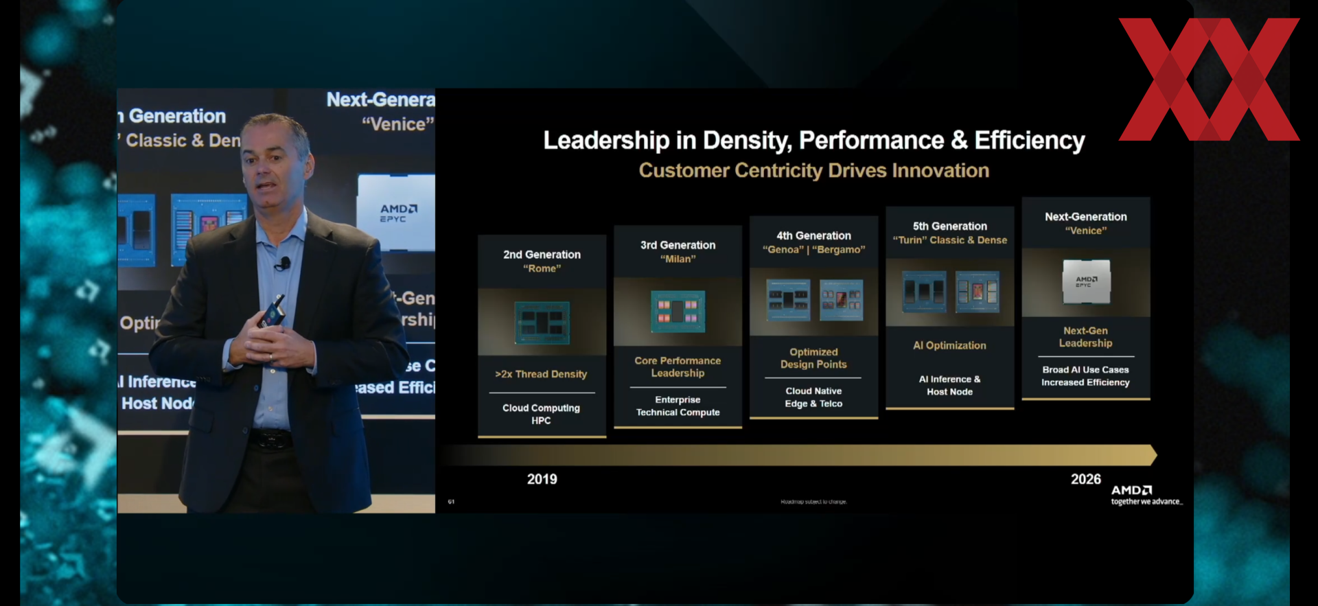 Die 6. Generation alias Venice auf Basis der Zen-6-Architektur soll eine um 30 % höhere Thread-Dichte zu bieten haben (sprich in etwa 30 % mehr Kerne) und bietet eine um 70 % höhere Leistung und Effizienz. Mit Venice will AMD dann endgültig den besten Server-Prozessor am Markt zu bieten haben, der seine Konkurrenz in allen Belangen aussticht.