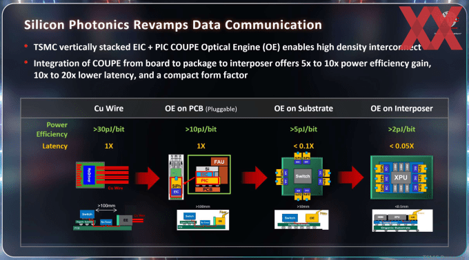 Die aktuellen Kupfer-Verbindungen kommen laut TSMC auf eine Übertragungseffizienz von >30 pJ/Bit. In einem ersten Schritt sollen nun sogenannte Optical Engines (OE) auf dem PCB integriert werden – beispielsweise über ein Optical Compute Interconnect (OCI) Chiplet. Hinsichtlich der Latenz bietet diese Methode keinerlei Verbesserungen, wohl aber in der Effizienz der Übertragung, die bei >10 pJ/Bit liegen soll.