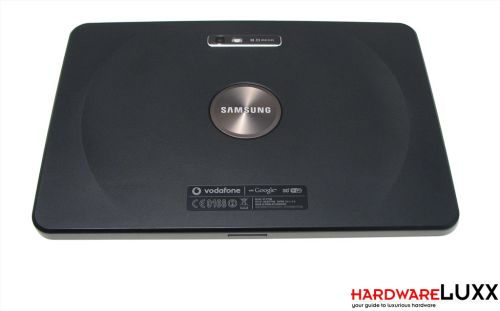 Für die Rückseite des GALAXY Tab 10.1v hat Samsung auf texturierten Kunststoff zurückgegriffen. In Kombination mit der leichten Wölbung sorgt die Materialwahl dafür, dass das Tablet gut in der Hand liegt. Abgesehen von dem mittig eingearbeiteten Samsung-Logo sticht auf dieser Seite vor allem die 8-MP-Kamera mit LED-Blitz hervor.