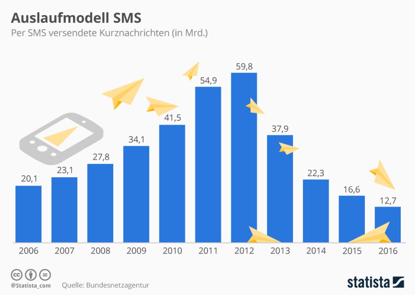 12,7 Mrd. SMS haben die Deutschen laut der Bundesnetzagentur 2016 nur noch verschickt. Das mag sich immer noch nach viel anhören, entspricht gegenüber dem Jahr 2015 aber einem Rückgang um 23 %. 2012 hatte der Versand von SMS seinen Höhepunkt erreicht und lag in Deutschland bei 59,8 Mrd. Nachrichten. Seitdem ging es aber stetig bergab. Schon 2013 waren es beispielsweise nur noch 37,9 Mrd. Nachrichten. Damals haben wir über das Minus berichtet. Vermutlich dürfte weiteres Minus folgen, da generationsübergreifend mittlerweile mit mobilen Messengern gearbeitet wird. Entsprechend gleichen die Provider ihre Einnahmeverluste aus dem SMS-Bereich mittlerweile auch mit mobilem Datenvolumen und anderen Dienstleistungen aus.