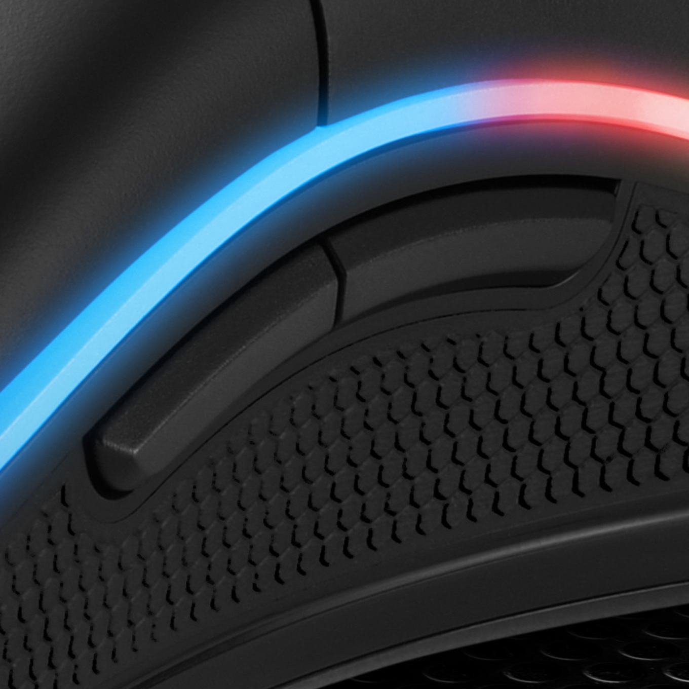 Eine zusätzliche Taste an der Unterseite wechselt zwischen den sechs Beleuchtungseffekten. Dabei wird ein umlaufender RGB-Streifen beleuchtet. Bei Bedarf kann die Beleuchtung auch komplett ausgeschaltet werden. Für eine unkomplizierte Nutzung hat Sharkoon auf eine separate Software für die Beleuchtungssteuerung und die Anpassung anderer Einstellungen verzichtet. Die Maus ist 132 x 69 x 42 mm (L x B x H) groß und 106 g schwer.