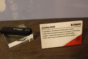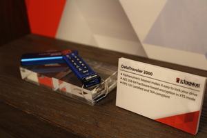 Im Speicherbereich hat Kingston neben dem DataTraveler 2000 auch den IronKey 3000 vorgestellt. Die Besonderheit ist dabei die integrierte Verschlüsselung zu nennen. Beim DataTraveler 2000 bietet man seinen Kunden eine Hardware-Verschlüsselung über einen Pin-Code an. Dieser muss direkt am Stick eingegeben werden, um an die gespeicherten Daten zu gelangen. Der IronKey 3000 hingegen wird mit einer Software-Verschlüsselung daherkommen. Zwar konnte man uns noch keinen Termin und Preis nennen, allerdings dürfte der IronKey 3000 günstiger als der DataTraveler 2000 verkauft werden.