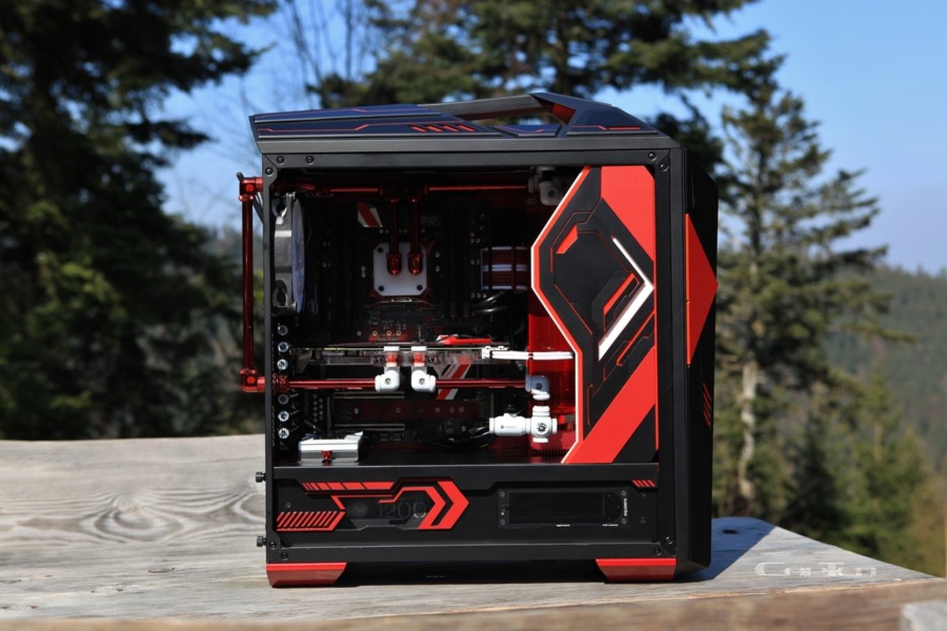 Hier setzt der Modder auf eine leistungsstarke X99-Plattform mit Intel-Core-i7-6850K-Prozessor, eine NVIDIA GeForce GTX 970 und einem leistungsstarken 1.200-W-Netzteil sowie natürlich eine teure Wasserkühlung der Marke Eigenbau. Der Innenraum sollte möglich dezent wirken – störende Kabel sollten hinter einer eigenen Abdeckung versteckt, die aufwendige Wasserkühlung möglichst minimalistisch gehalten werden. Statt auf ein handelsübliches Schlauchsystem zu setzen, hat sich „capten“ für ein platzsparendes Rohrsystem entschieden, welches der Optik zwar zugutekommt und damit den Luxus-Anspruch abermals unterstreicht, jedoch auch viel Eigenleistung und vor allem eine gute Planung im Vorfeld voraussetzt.