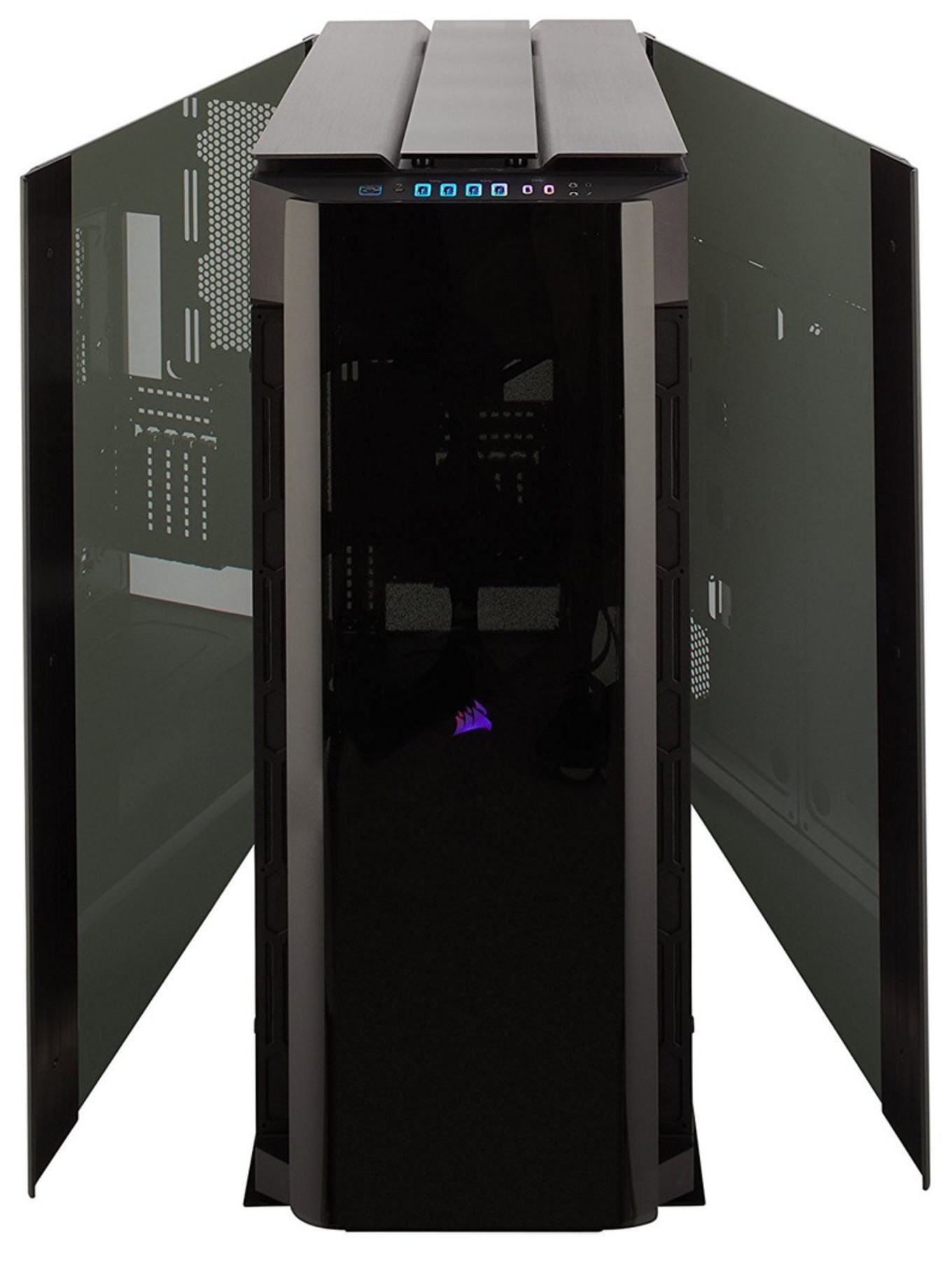 Das Design erinnert an das kürzlich von uns getestete Obsidian Series 500D. Die neuen Obsidian Series-Modelle zeigen äußerlich viel Aluminium und Glas. Auch beim Flaggschiff lassen sich die beiden Glasseitenteile als Türen öffnen. Anders als beim kleineren Obsidian Series 500D zeigt sich beim Obsidian Series 1000D auch die Front gläsern. Damit RGB-Beleuchtung und Lüfter komfortabel gesteuert werden können, liefert Corsair das Flaggschiff gleich mit vormontiertem Commander PRO aus. Nicht gespart wird schließlich auch an den Anschlüssen. Es können gleich zwei USB 3.1 Typ-C-Ports, vier USB 3.1 Typ-A-Ports und die üblichen 3,5-mm-Klinkenbuchsen genutzt werden.