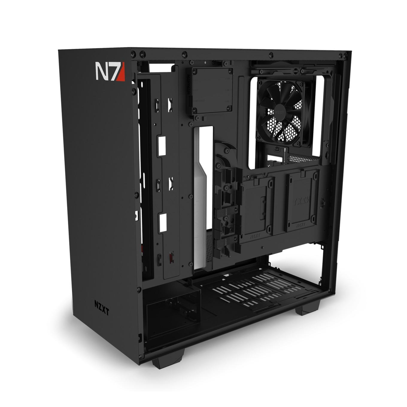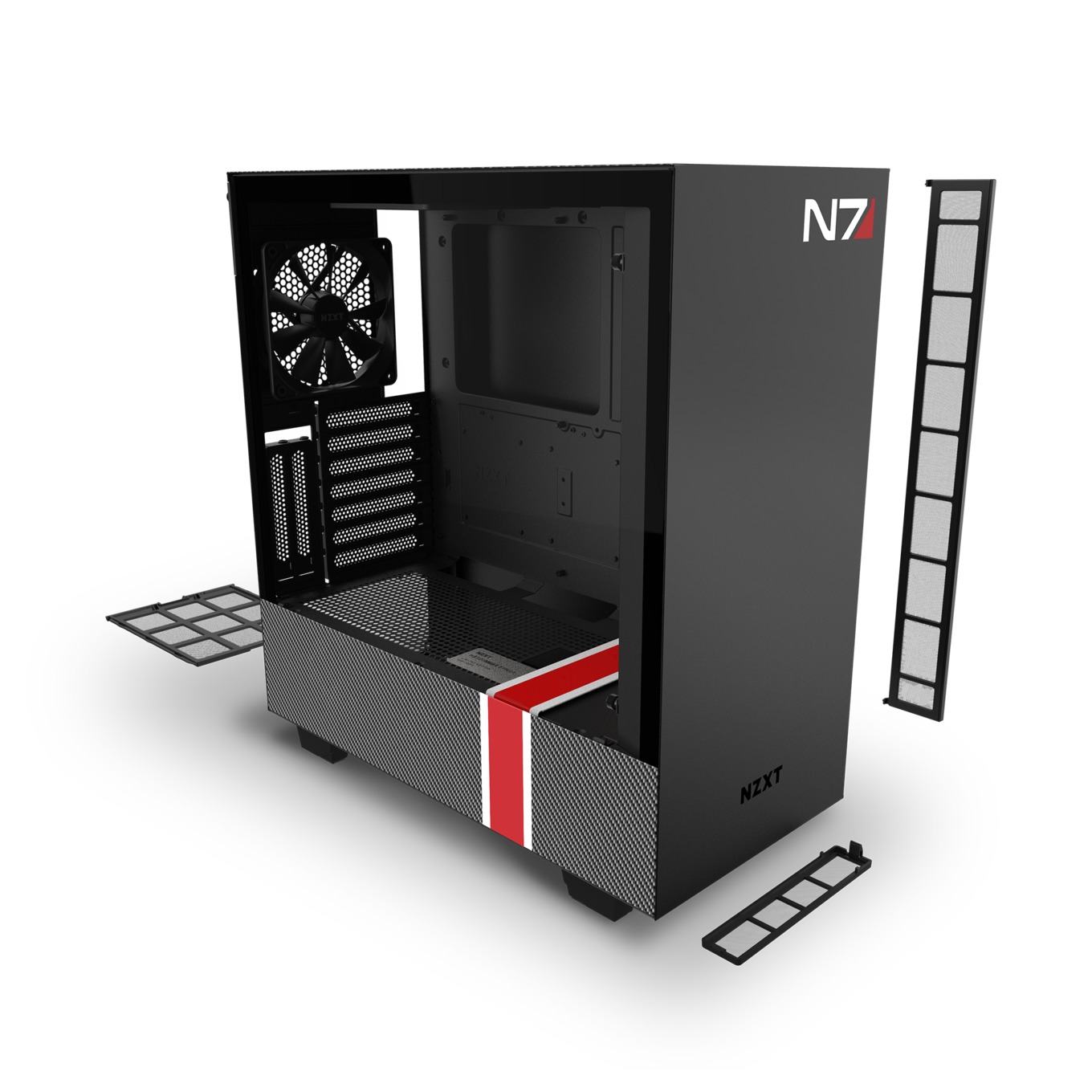 Das CRFT 07 basiert auf dem H510i-Gehäuse von NZXT und wurde bei der Gestaltung von der Panzerung des N7 inspiriert. Auch das neue Case der Reihe ist streng limitiert. Die Auflage des CRFT 07 beläuft sich auf insgesamt 500 Stück. Die Karbonfaser-Gestaltung sowie der rot-weiße Streifen imitieren laut Angaben des Unternehmens die N7-Rüstung aus dem Spiel. Außerdem ist im Lieferumfang ein Anhänger enthalten, der von beiden Seiten am Gehäuse befestigt werden kann. Somit haben alle Gamer die Wahl entweder das Paragon- oder das Renegade-Symbol zur Schau zu stellen.
