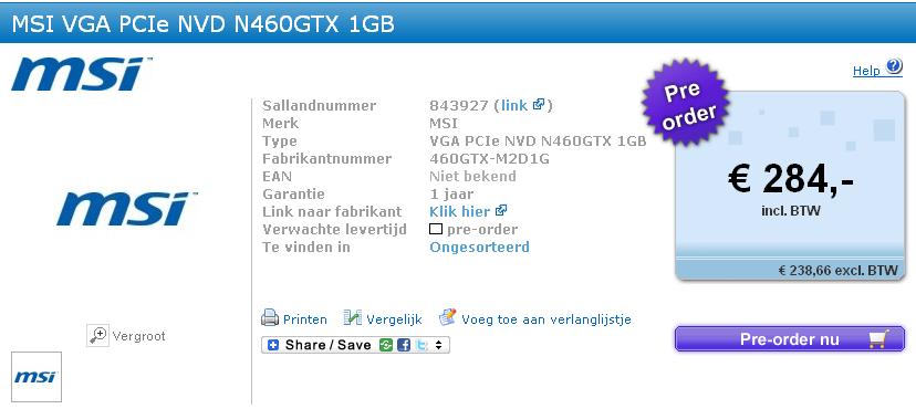 Schon seit einigen Wochen geistert die NVIDIA GeForce GTX 460 durch das Internet. Während man jüngst von einer NVIDIA GeForce GTX 465 ausging und ihr 352 Shadereinheiten und einen 1024 MB großen Videospeicher samt 256 Bit breitem Speicherinterface zuschrieb, tauchte der nächste Fermi-Ableger nun erstmals im Einzelhandel auf. So listete der niederländische Onlineshop Salland.eu eine MSI N460GTX, die ab sofort für 284 Euro vorbestellt werden kann. Einen genauen Liefertermin sowie erste Bilder und weitere Eckdaten lieferte man jedoch noch nicht. Allerdings ist davon auszugehen, dass die NVIDIA GeForce GTX 460 tatsächlich unter diesem Namen verkauft und wohl auch rechtzeitig zur Computex 2010, welche am 01. Juni ihre Pforten öffnet, kommen wird. Alles Wissenswerte zum kommenden DirectX-11-Grafikbeschleuniger von NVIDIA finden Sie im Übrigen unter diesem Link.