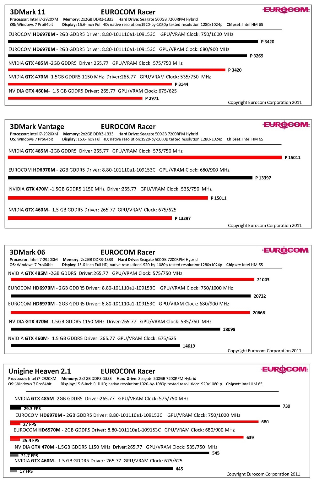 In ersten Tests konnte die Radeon HD 6970M zusammen mit einem Intel Core i7-2920XM und 4096 MB DDR3-Arbeitsspeicher bei einer Auflösung von jeweils 1920 x 1080 Bildpunkten im 3DMark Vantage P13397 Punkte erzielen. In Futuremarks neustem Benchmark waren es hingegen P3269. Auch Unigine Heaven 2.1 lief mit durchschnittlich 25,4 FPS erstaunlich flüssig über das 15,6-Zoll-Display. Mit höheren Taktraten von 750/4000 MHz war natürlich noch ein bisschen mehr Performance aus dem flotten Notebookchip herauszuholen.