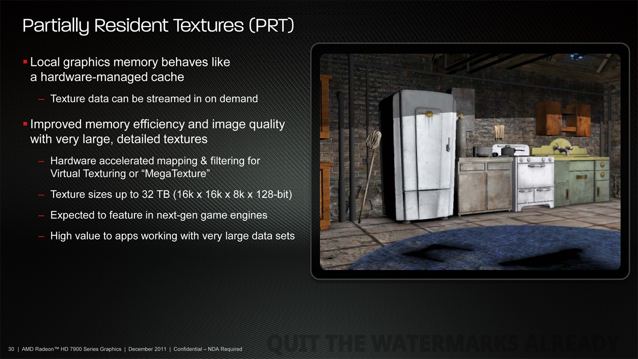 "Partially Resident Textures" (PRT) sind eine Technologie, bei denen Texturen nicht klassisch im Grafikspeicher abgelegt werden, sondern dieser wie eine Art Cache verwendet wird.
