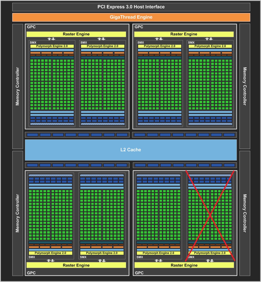 Beim Speicherinterface soll NVIDIA im Vergleich zur GeForce GTX 680 keinen Rotstift ansetzen und weiterhin insgesamt vier 64-Bit-Controller und damit einen 256 Bit breiten Datenbus einsetzen. Bislang teilten sich immer zwei GDDR5-Speicherchips einen Controller, sodass sich unter Verwendung von 256-MB-Chips eine Gesamtmenge des Videospeichers von 2048 MB ergeben würde. Auch die 32 Rasteroperation-Units dürften damit weiter bestehen bleiben. Über die finalen Taktraten will die stets gut bediente Gerüchteküche bislang noch keine handfesten Informationen erfahren haben. Sie geht allerdings von Frequenzen um die 900 respektive 1000 MHz aus. Einen Boost-Takt wird es hier mit Sicherheit auch wieder geben. Ob dieser darin schon eingerechnet ist, ist nicht bekannt. Insgesamt würde die kalifornische Grafikschmiede damit auf die Radeon HD 7950 abzielen und diese wohl auch gut in Schacht halten können.