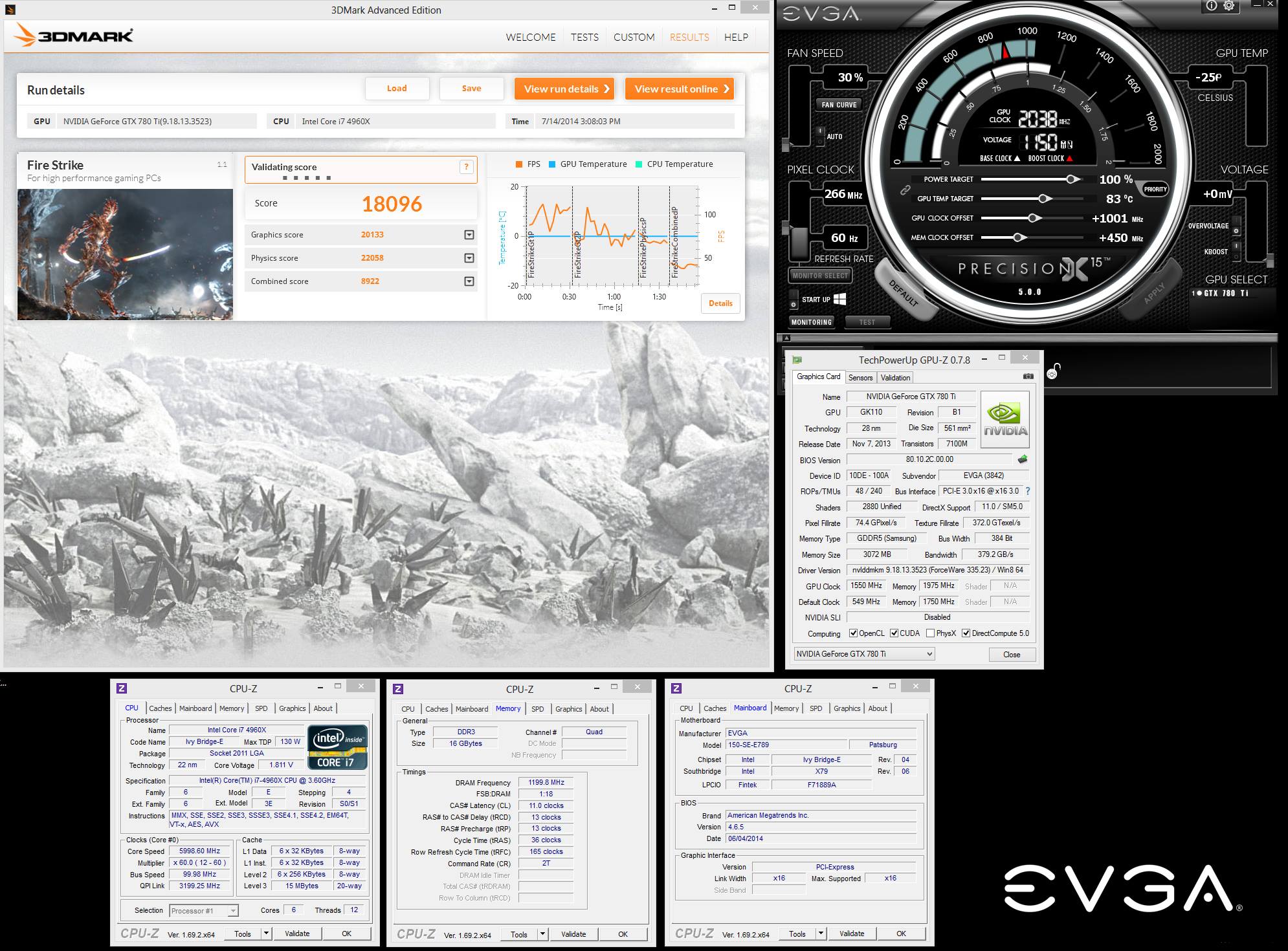 Nun hat der Haus- und Hof-Overclocker von EVGA noch eine Schippe draufgelegt und steigerte den Takt noch weiter, wurde dabei aber von einem Bug des EVGA-Precision-Tools ausgebremst. So erreichte er dieses Mal mit 2.038 MHz einen nur geringfügig höheren GPU-Takt, sieht die 2.100 MHz aber durchaus im Bereich des Möglichen. Der GDDR5-Grafikspeicher lieg dabei mit 1.950 MHz. 8.950 Punkte im Fire-Strike-Extreme-Preset bedeuten für Kingpin die Einstellung des eigenen Rekords und damit setzt er sich auch weiter von den Mitwettbewerbern ab. Die 18.096 Punkte im Fire-Strike-Preset sind dabei natürlich ebenfalls nicht zu verachten und stellen auch hier einen neuen Rekord dar. Die 2.100 MHz sieht Kingpin durchaus in Reichweite und arbeitet bereits an einer "Lösung" für dieses Problem.