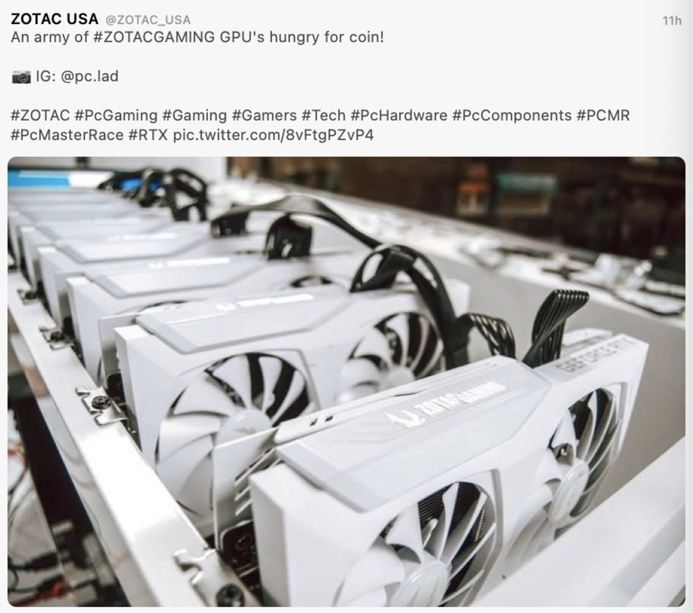 Das sieht offenbar nicht jeder Hersteller so. Die US-amerikanische Social-Media-Abteilung von ZOTAC hielt es jedenfalls für eine gute Idee, ein Foto zahlreicher Grafikkarten zu veröffentlichen, die offenbar für das Mining eingesetzt werden. Nur noch ironisch zu verstehen sind die beigefügten Hashtags wie #PCGaming und #Gaming, denn damit hat eine "Armee von GPUs die hungrig nach Coins sind" ganz offenkundig wenig zu tun.