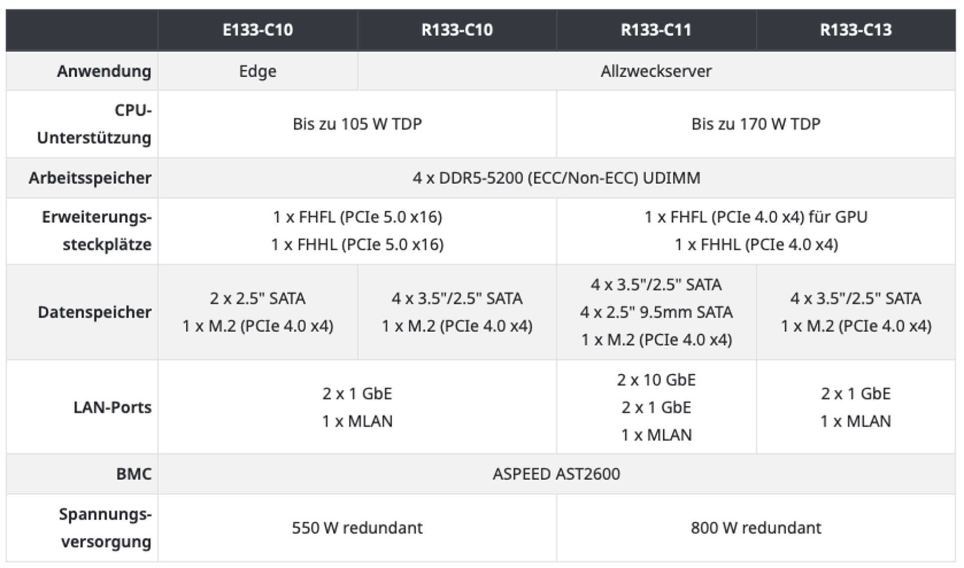 Gigabyte hat nun mit dem E133-C10 einen Edge-Server sowie mit den Modellen R133-C10, R133-C11 und R133-C13 Rack-Server vorgestellt, die Ryzen-7000-Prozessoren mit einer TDP von 105 und 170 W unterstützen. Je nach Anwendungsbereich unterstützen die Server zwei 10GbE-Anschlüsse oder unterstützen Dual-Slot-GPUs.