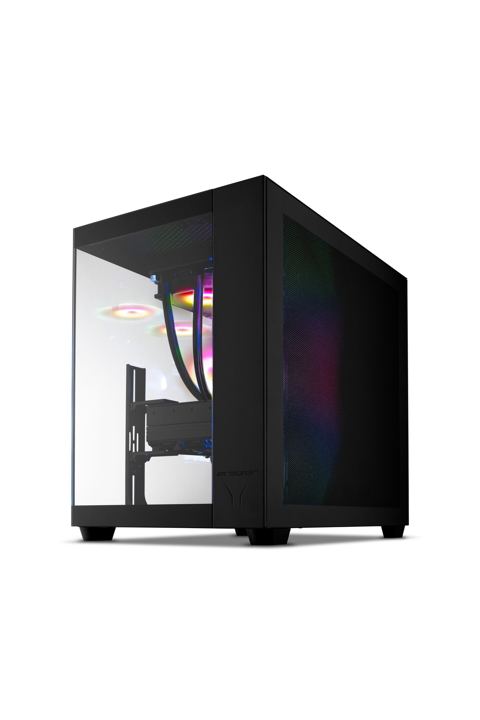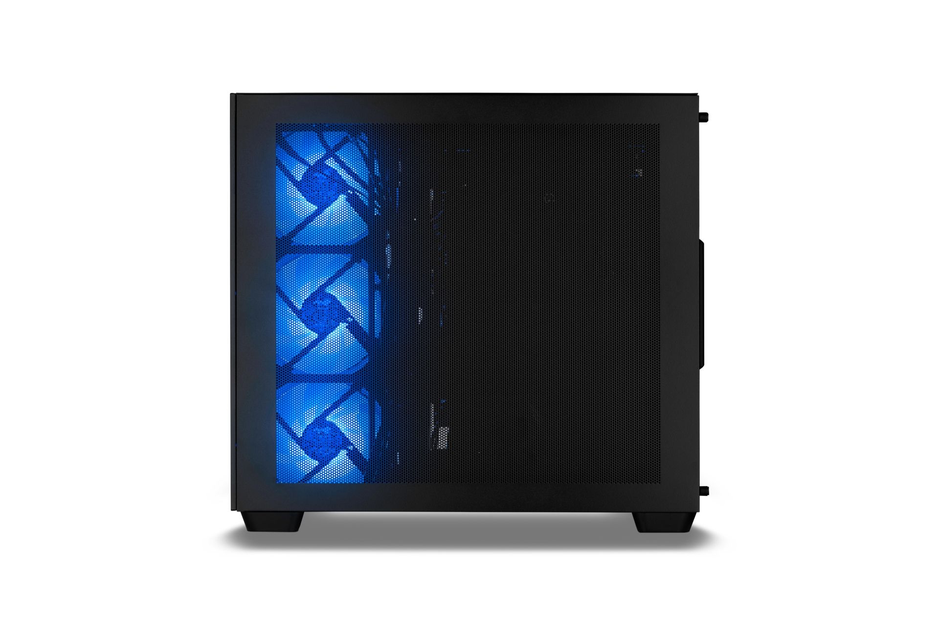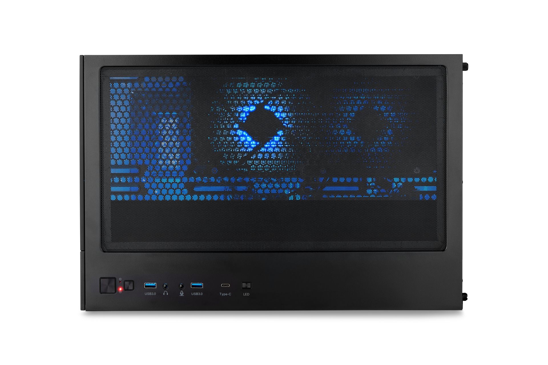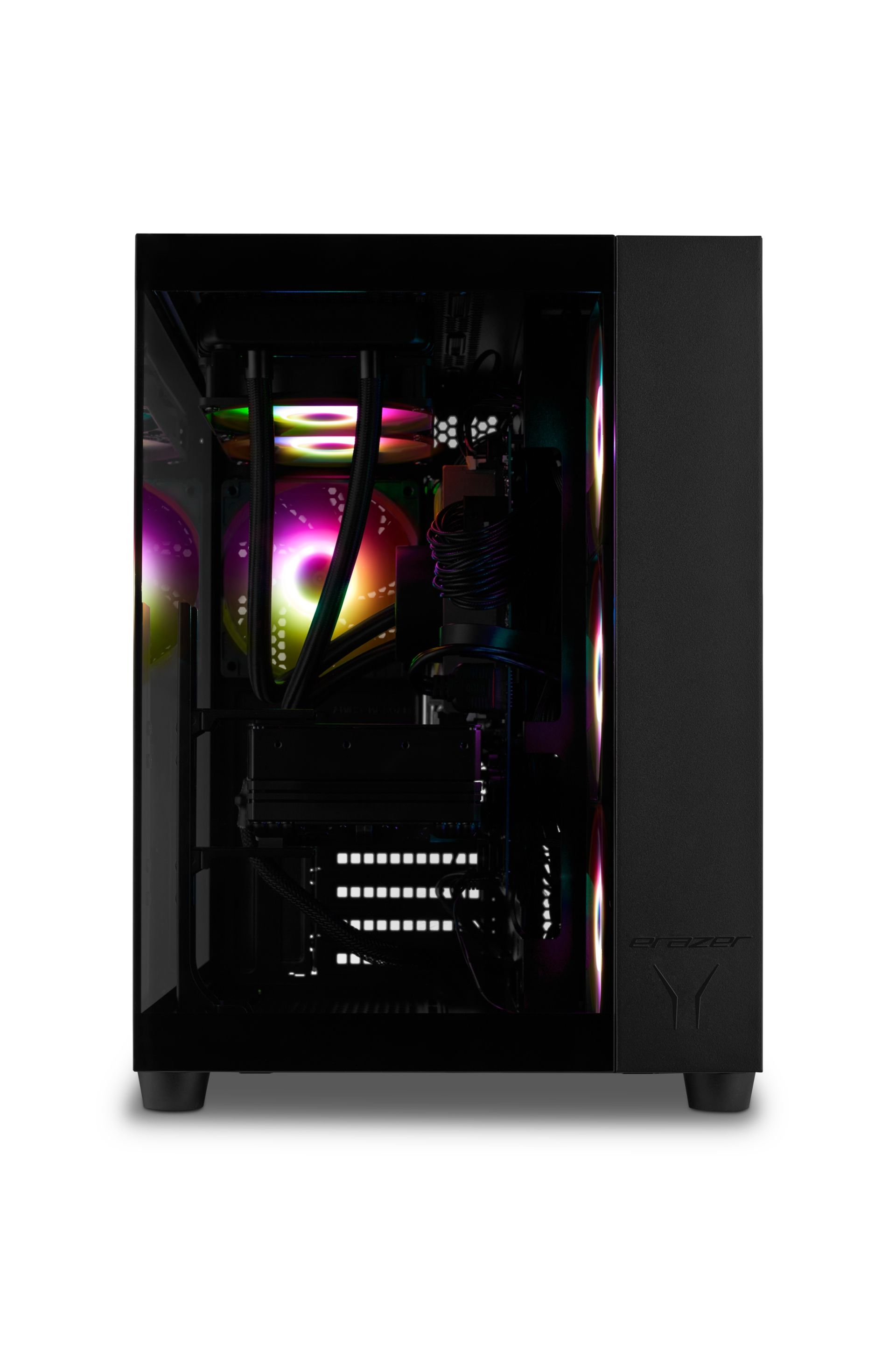 Durch die großflächigen Glas-Panels des InWin-Gehäuses können die RGB-Beleuchtung des RAMs und die farbigen Effekte der sechs aRGB-Lüfter besonders zur Geltung kommen. Bei den Frontanschlüssen des Gehäuses stehen ein USB 3.2 Gen 1 Type-C sowie zwei USB 3.2 Gen 1 Type-A bereit. Der Mic in- und Audio out-Anschluss sind obligatorisch. Eine Grafikkartenhalterung ist ebenfalls vorhanden. Mit Strom versorgt wird der PC von einem InWin mit 850 W. In Sachen Kühlung wird auf eine InWin-240-Wasserkühlung gesetzt, die den Prozessor zuverlässig auf niedrigen Temperaturen halten soll und bei längeren Gaming-Sessions konstante Leistung verspricht.
