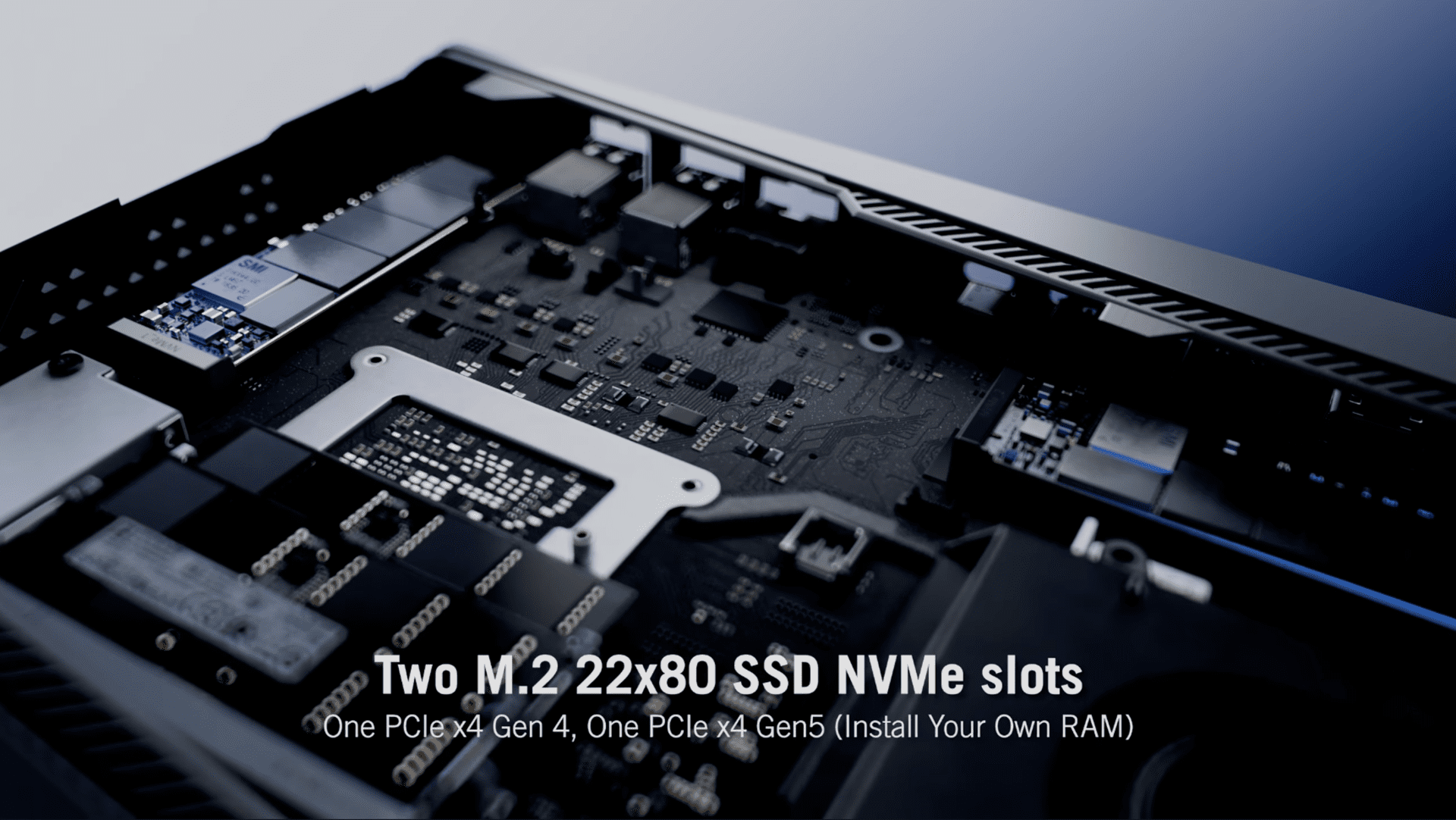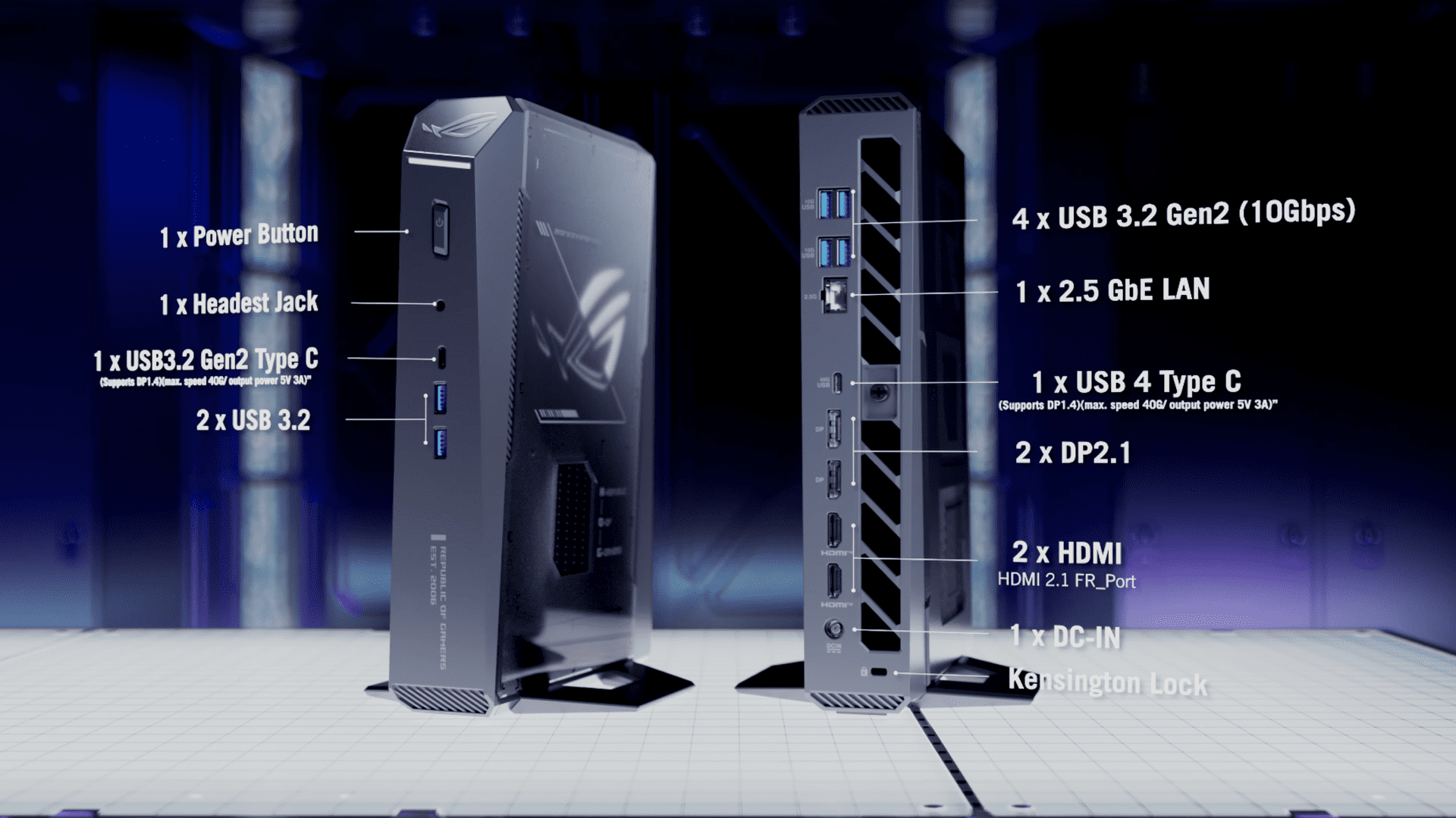 Auf der Front befinden sich ein Ein/Ausschalter sowie ein 3,5-mm-Audioanschluss. Hinzu kommen einmal USB 3.2 Gen 2 Typ-C und zweimal USB 3.2 Typ-A. Auf der Rückseite befinden sich die Display-Ausgänge, über die vier Monitore angesteuert werden können. Dazu vorhanden sind jeweils zweimal HDMI 2.1 und DisplayPort 2.1. Außerdem noch vorhanden sind viermal USB 3.2 Gen 2 Typ-A, einmal USB4 Typ-C und ein 2,5GbE. Die Stromversorgung der Hardware erfolgt über ein externes Netzteil.
