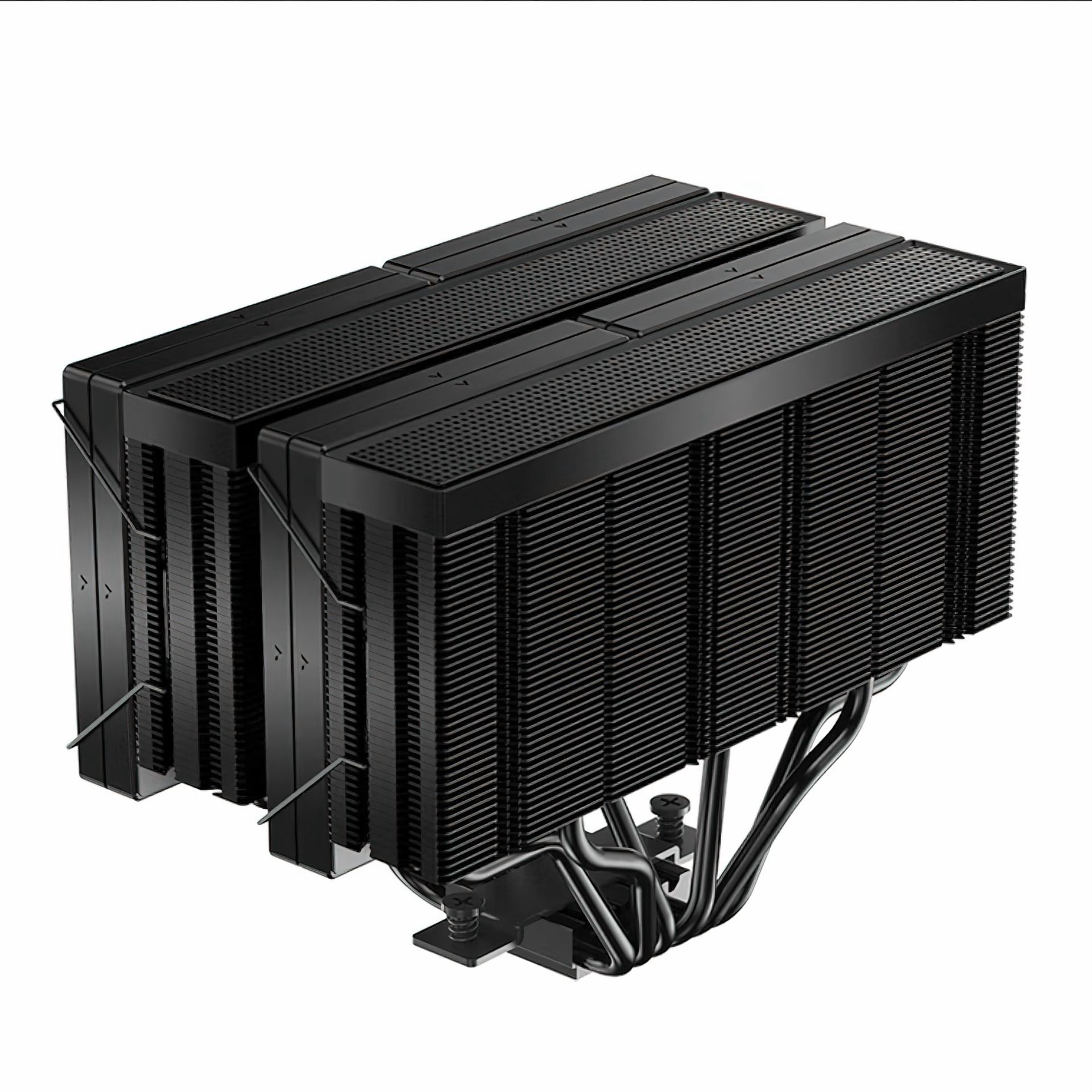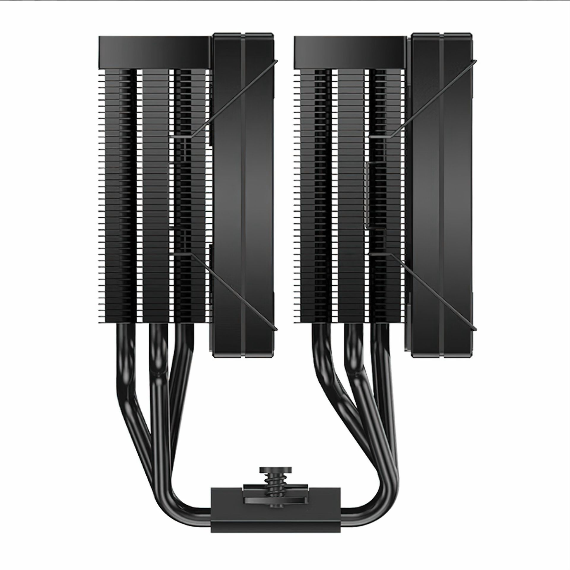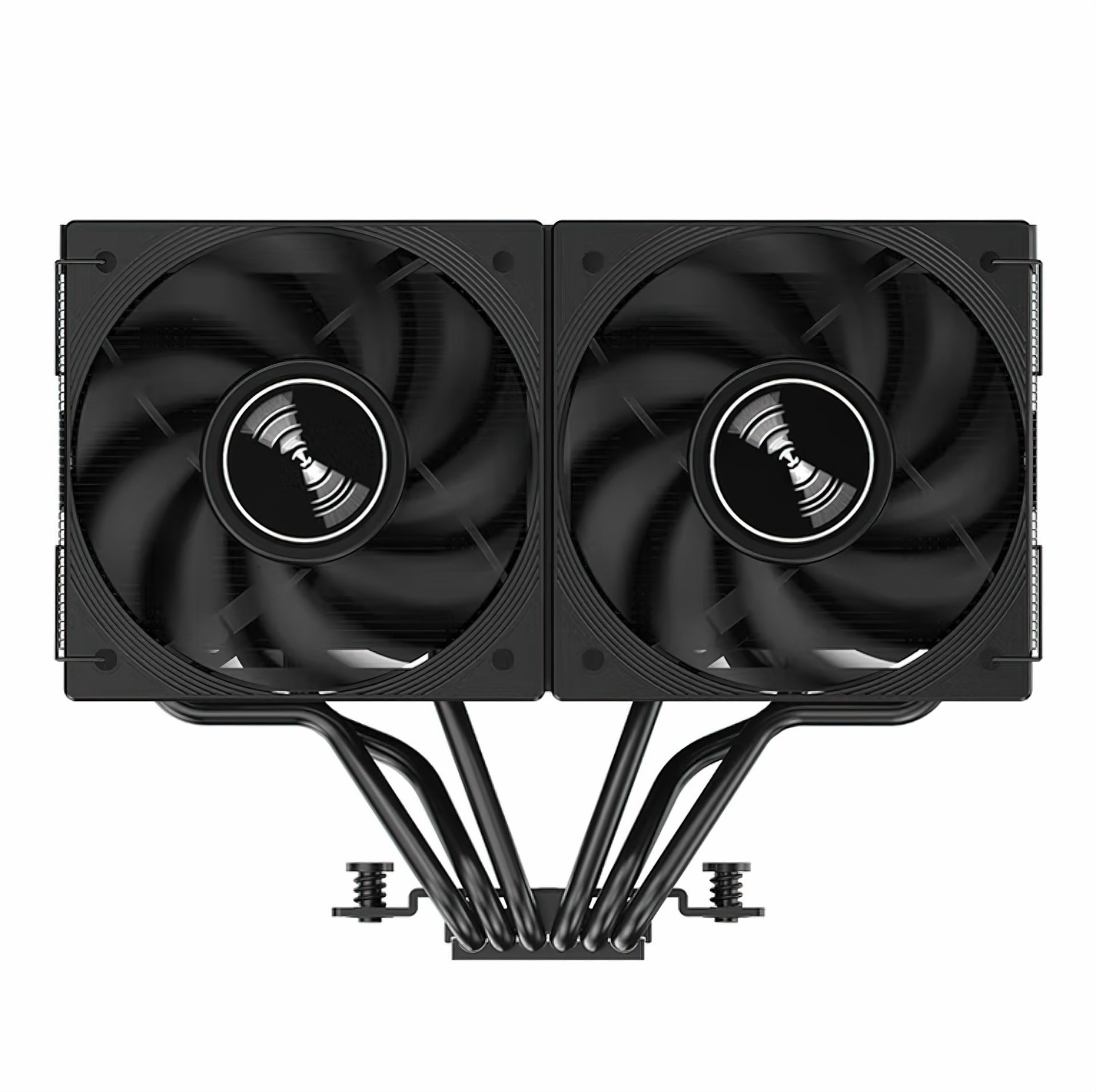Der Kühler besteht aus zwei massiven Aluminiumfinblöcken, die durch sechs vergrößerte Heatpipes miteinander verbunden sind. Die Wärmeableitung erfolgt über vier 100-mm-Lüfter mit PWM-Steuerung, die je nach Lastzustand mit Drehzahlen zwischen 1.000 und 2.700 U/min arbeiten. Zwei Lüfter sind außen angebracht, zwei weitere befinden sich mittig zwischen den Finblöcken. Der erzeugte Luftdurchsatz liegt je nach Drehzahl zwischen 19,49 und 55,46 CFM. Die Lüfter verwenden standardisierte 4-Pin-Anschlüsse, was die Kompatibilität mit gängigen Mainboards sicherstellt.