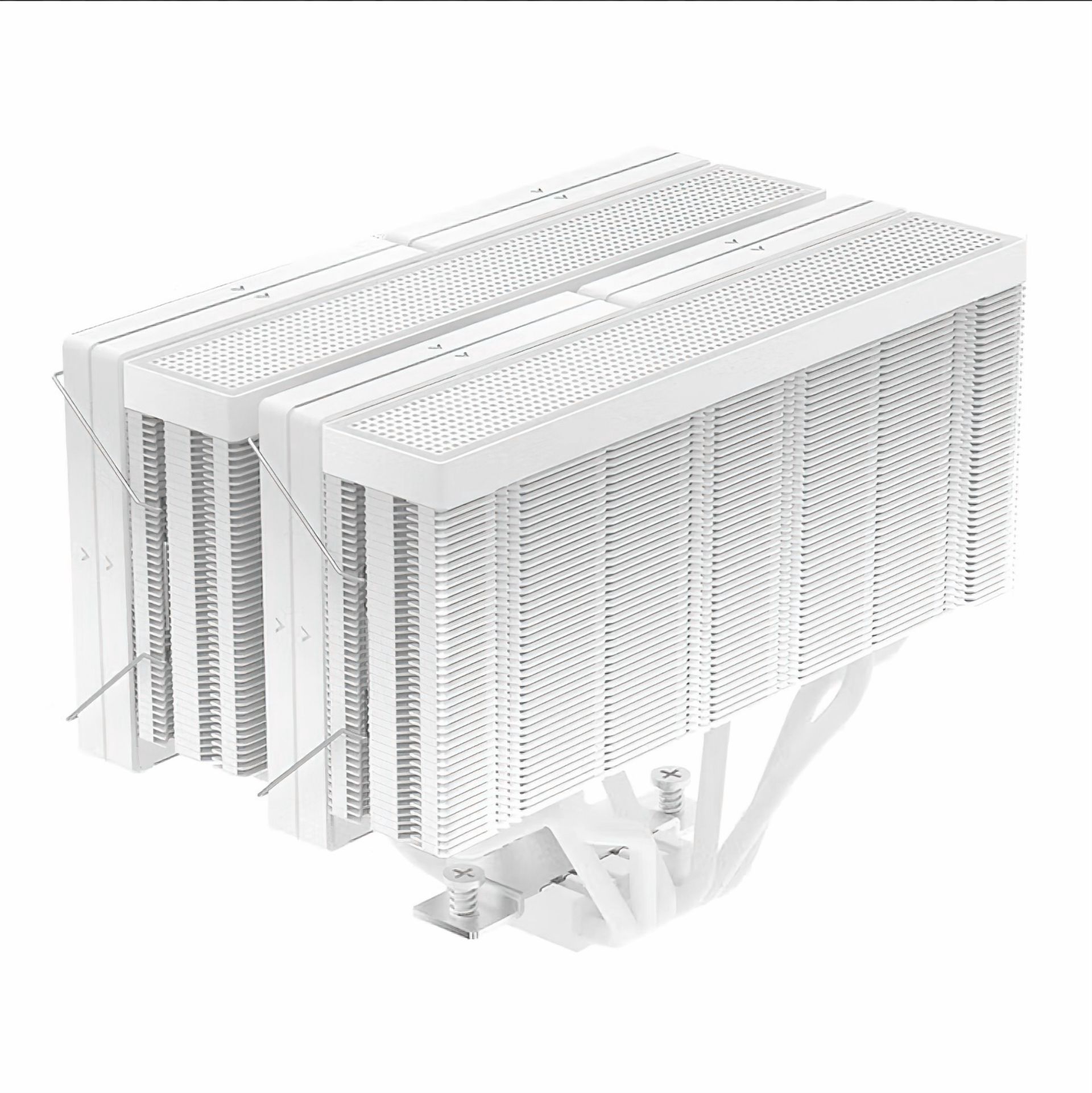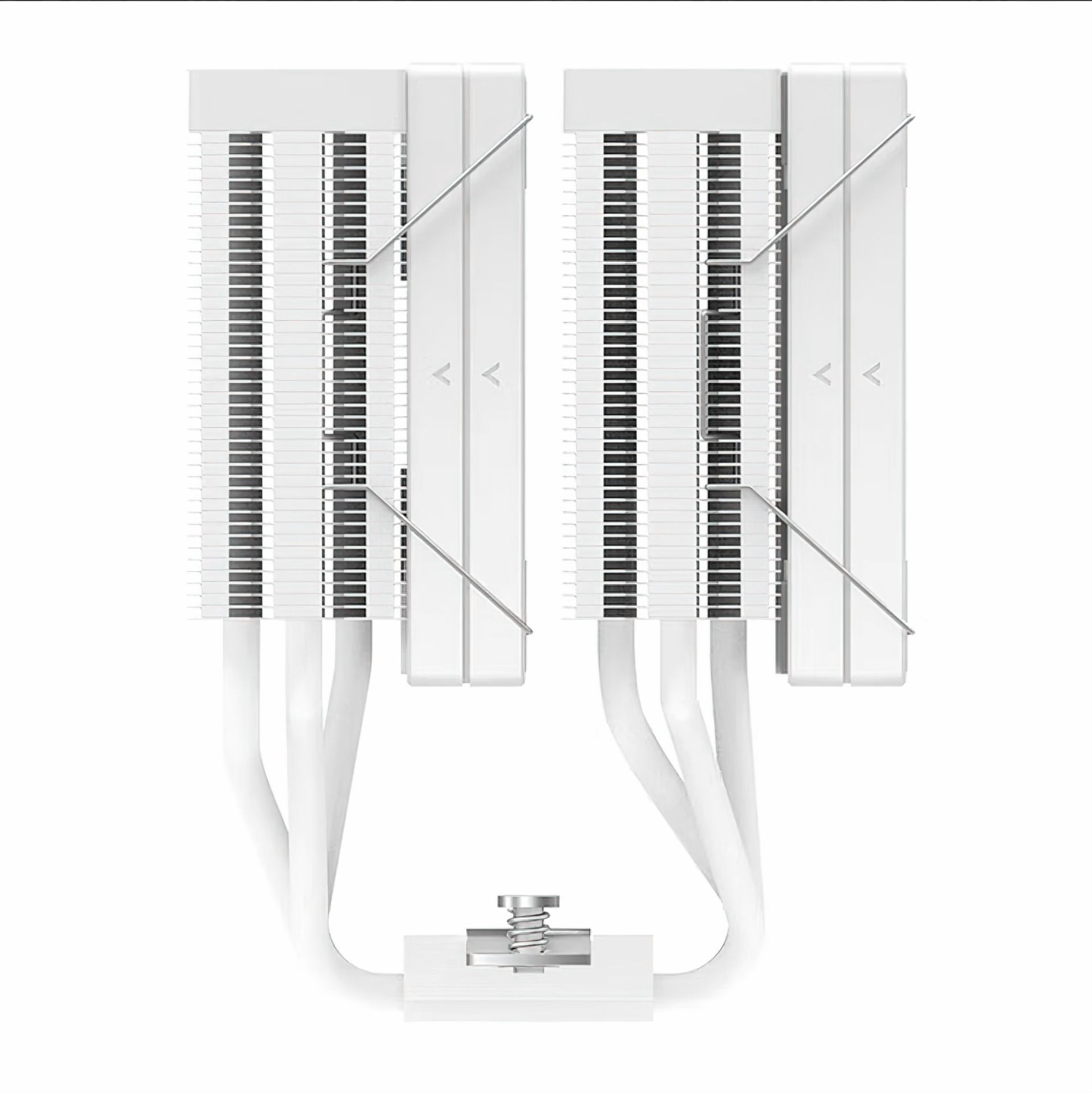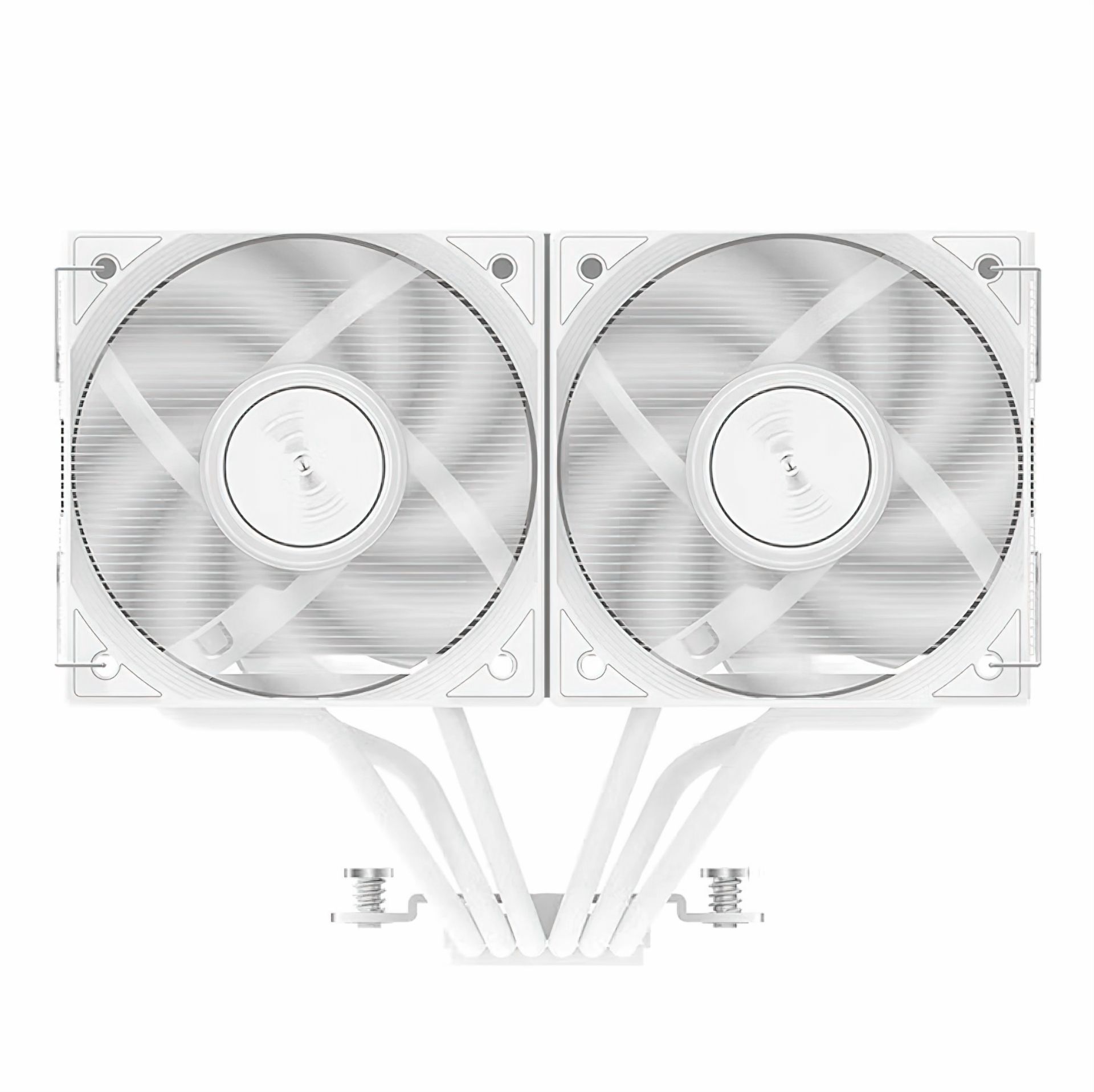 Der Kühler besteht aus zwei massiven Aluminiumfinblöcken, die durch sechs vergrößerte Heatpipes miteinander verbunden sind. Die Wärmeableitung erfolgt über vier 100-mm-Lüfter mit PWM-Steuerung, die je nach Lastzustand mit Drehzahlen zwischen 1.000 und 2.700 U/min arbeiten. Zwei Lüfter sind außen angebracht, zwei weitere befinden sich mittig zwischen den Finblöcken. Der erzeugte Luftdurchsatz liegt je nach Drehzahl zwischen 19,49 und 55,46 CFM. Die Lüfter verwenden standardisierte 4-Pin-Anschlüsse, was die Kompatibilität mit gängigen Mainboards sicherstellt.
