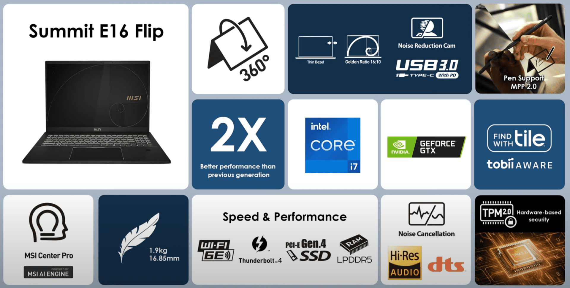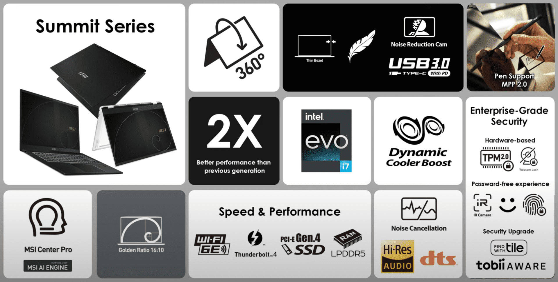 Bei der Grafikbeschleunigung vertraut das MSI Summit E14 und E14 Flip auf die integrierte Intel Iris Xe Graphics, dazu gibt es bis zu 32 GB LPDDR5-Arbeitsspeicher und eine schnelle NVMe-SSD, die per PCI-Express 4.0 angebunden wird. Das Display misst namensgebend 14 Zoll in seiner Diagonalen und bietet mindestens eine FHD+-Auflösung mit 1.920 x 1.200 Bildpunkten an. Das Flip Evo arbeitet sogar mit 2.880 x 1.800 Bildpunkten und damit mit QHD+. In beiden Fällen setzt man auf ein 16:10-Format, es sollen hochwertige Panels mit großer Farbraumabdeckung eingesetzt werden. Das Evo Flip ist obendrein kapazitiv und erlaubt damit die Bedienung per Fingertab oder dem optional erhältlichen MSI Pen.
