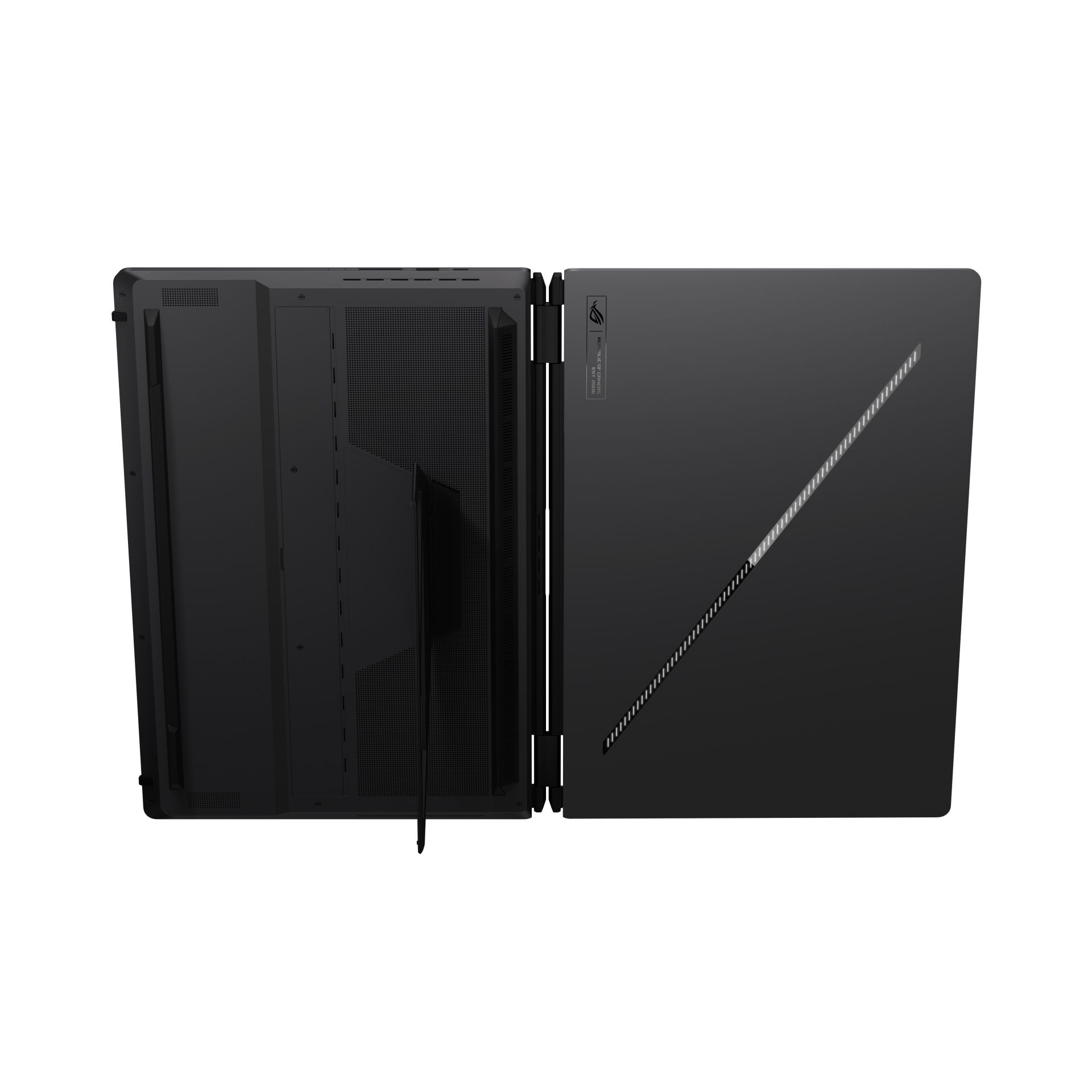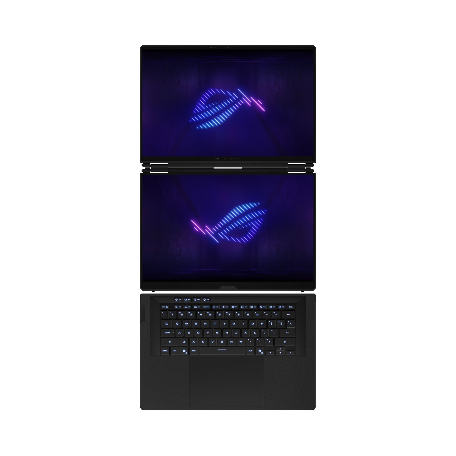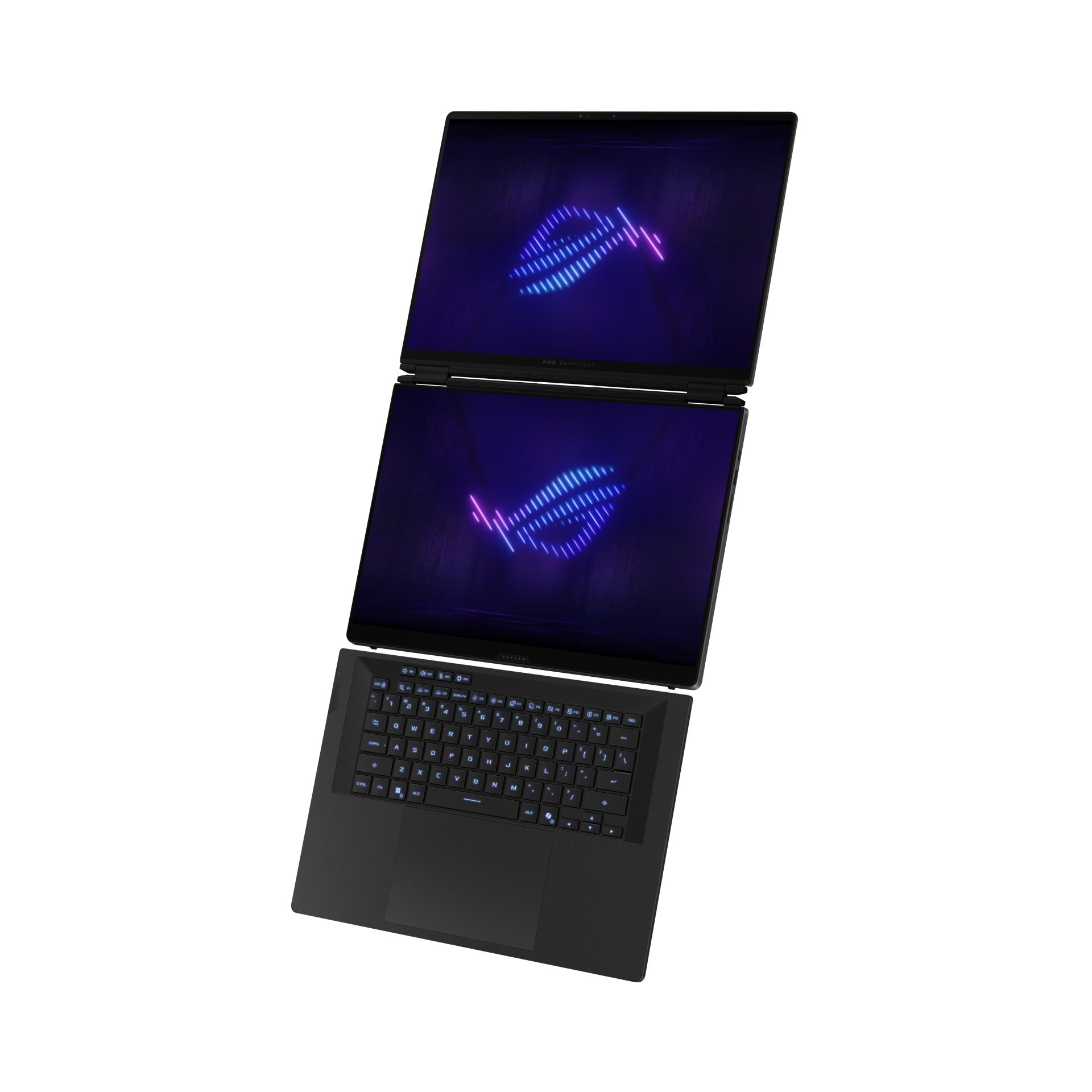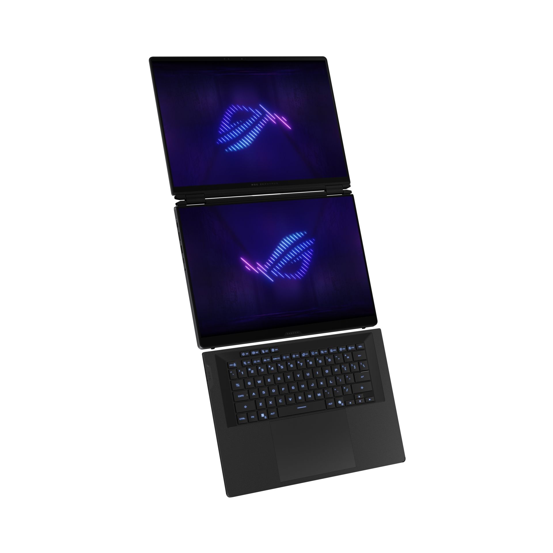 Während man bislang auf einen kleineren Zweitbildschirm direkt über der Tastatur setzte, sieht das neue Konzept wie beim Zenbook Duo zwei vollwertige OLED-Panels mit jeweils 16 Zoll vor, die beide touchfähig sind und mit 2.880 x 1.800 Bildpunkten auflösen. ASUS verspricht eine hohe Bildwiederholfrequenz von 120 Hz, eine schnelle Reaktionsgeschwindigkeit von nur 0,2 ms und Helligkeiten von über 1.100 Nits, womit HDR-Inhalte problemlos dargestellt werden können. Natürlich sollen beide Displays den DCI-P3-Farbraum vollumfänglich abdecken und sich somit auch für die professionelle Foto- und Videobearbeitung eignen. G-Sync-Support bietet zumindest das Hauptdisplay. Eine Glasoberfläche von Corning, Stiftunterstützung und die für ROG Nebula HDR zertifizierte Bildverarbeitung machen das Display auch für Content‑Creation, Farbkorrektur und digitales Zeichnen interessant.