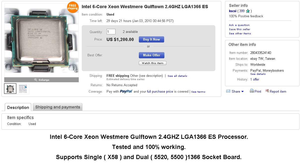 Wer nicht mehr abwarten kann, bis Intels Six-Core-CPU, Codename Gulftown, im nächsten Jahr im Handel erscheint, für den gibt es jetzt eine Alternative. Im größten Online-Auktionshaus eBay wird zurzeit ein solcher Gulftown-Chip versteigert, genauer gesagt sind noch zwei Exemplare zu haben. Natürlich handelt es sich dabei nicht um Retail-Chips für Endkunden, diese werden erst für das zweite Quartal 2010 erwartet, sondern um ein Engineering-Sample der Server-Variante Xeon mit 6x 2,4 GHz. Von solchen Sample-Chips tauchten bereits erste Benchmarks und ein ausführlicherer Test im Internet auf. Der Prozessor der Westmere-Generation in 32 nm passt in den Sockel 1366 und soll auch zum Desktop-Chipsatz X58 kompatibel sein. Aktuell liegen noch keine Gebote für den Artikel vor, aber für stolze 1200 US-Dollar kann man ihn sofort kaufen.