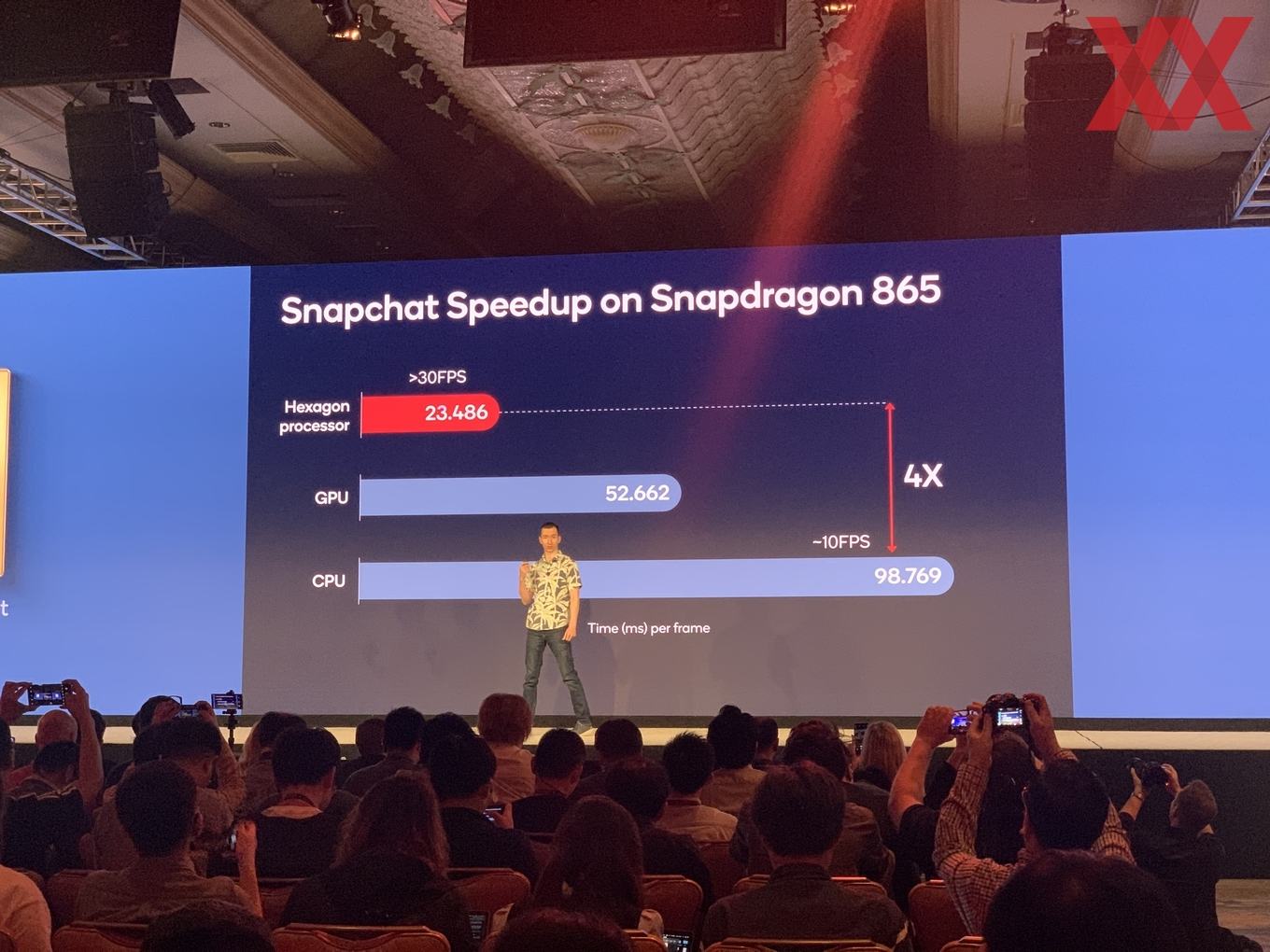 Die Funktionen werden dabei durch die Effizienz des SoC auch dauerhaft ermöglicht - beispielsweise könnte man realisieren, dass jede Musik erkannt wird und Titel und Interpret somit direkt über AI erkannt werden. Auch Filter, z.B. für Snapchat, können mit der Engine deutlich schneller über Live-Videos gelegt werden - ein Mitarbeiter von Snap gab auf der Bühne an, dass eine vierfache Performance erreicht worden sei.