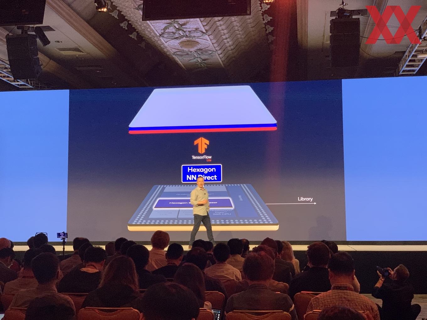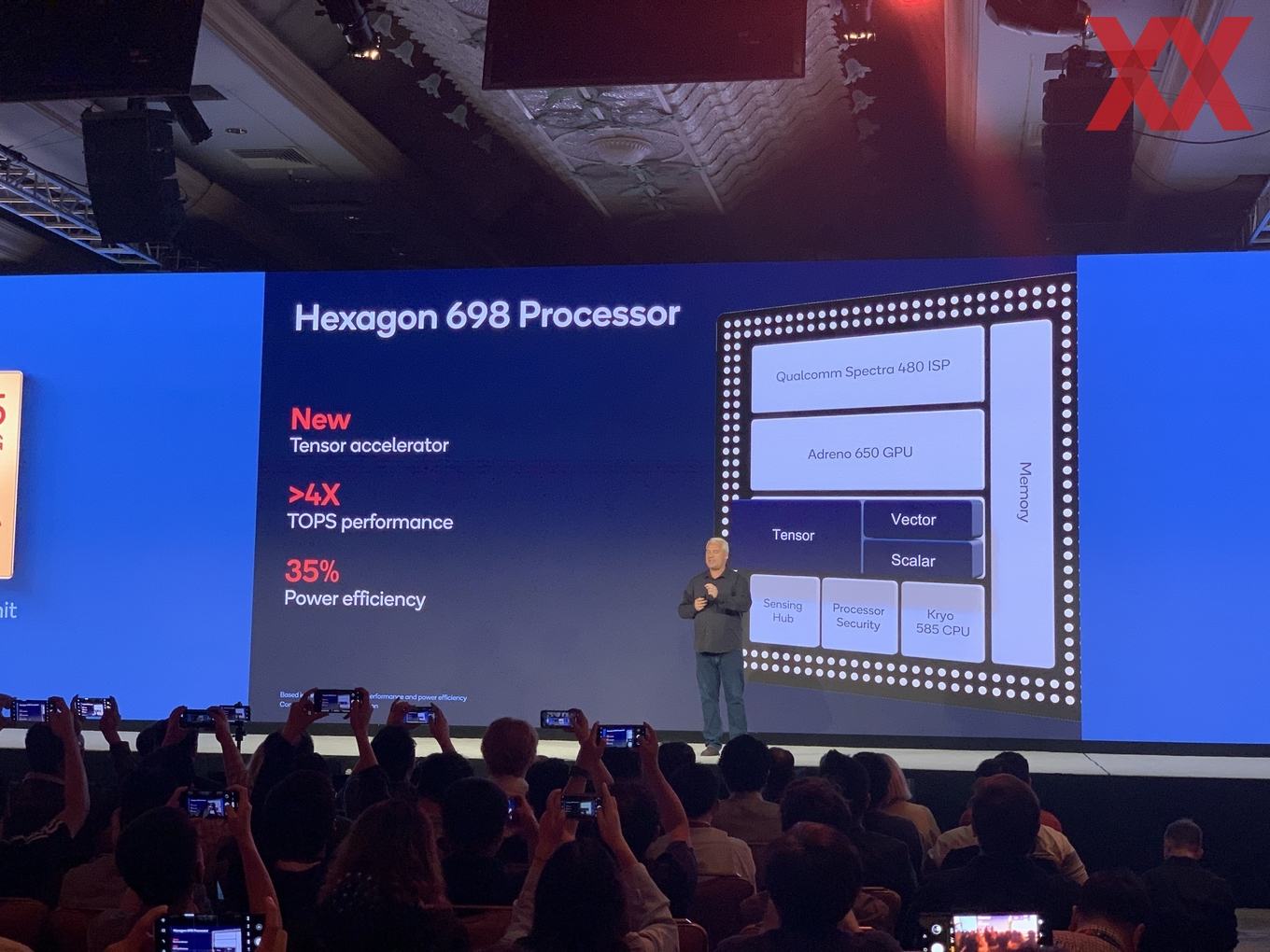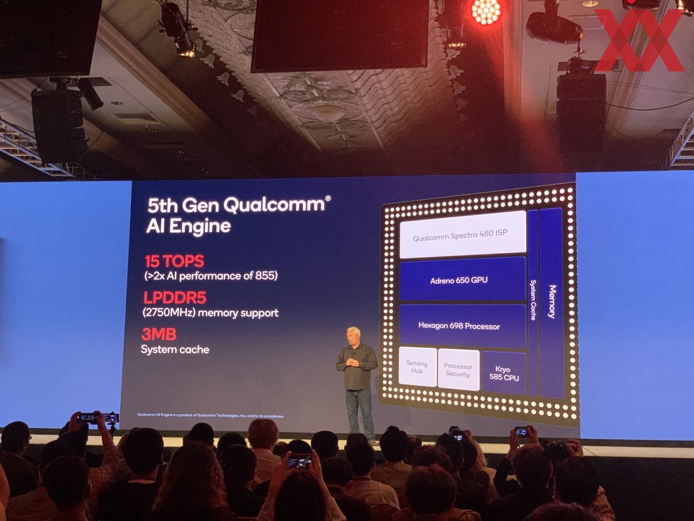 Stark verbessert hat Qualcomm die Hexagon-Einheit des SoC, die für die AI-Funktionen zuständig ist. Ziad Ashgar, der VP Product Marketing & AI bei Qualcomm, gab in der Keynote an, dass die Geschwindigkeit zum Vorgänger verdoppelt wurde. Insgesamt erreicht der Chip bei einer um 35 % geringeren Leistungsaufnahme 15 TOPS, der Chip unterstützt LPDDR5 mit 2.750 MHz, aber Hersteller könnten auch zum preiswerteren LPDDR4 greifen, wenn gewünscht. Qualcomm spendiert der AI-Sektion 3 MB System Cache zusätzlich.