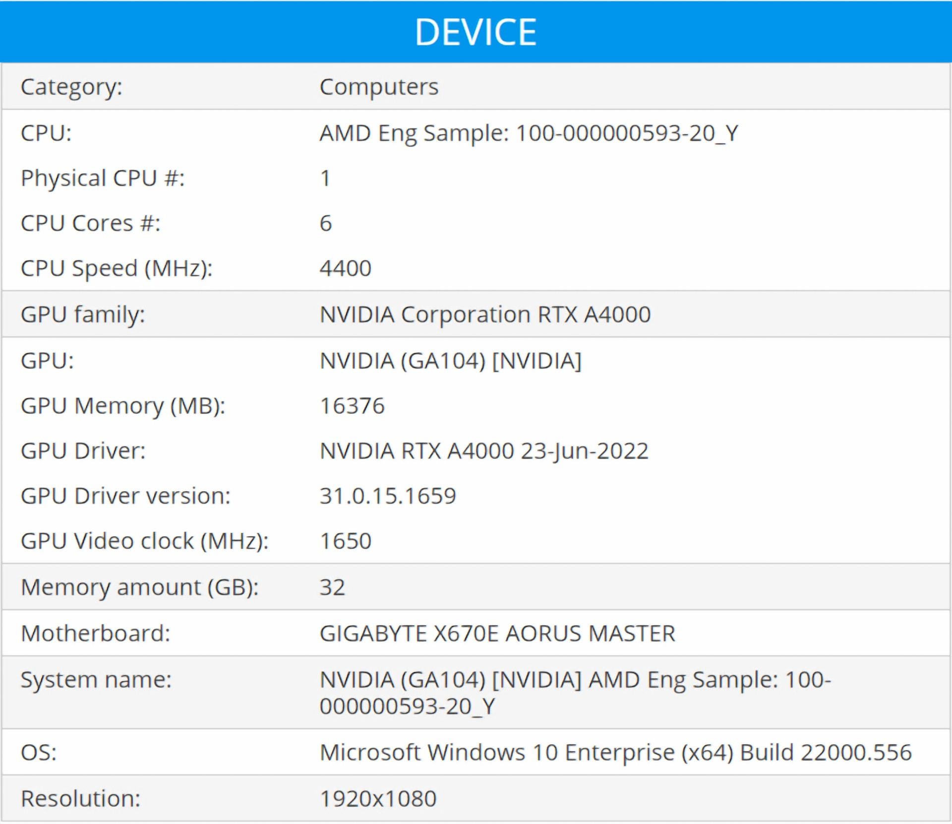 Das Engineering-Sample trägt den OPN-Code "100-000000593-20_Y" und bringt sechs Kerne mit, die mit 4,4 GHz getaktet sind. Dieser potentielle Ryzen 5 7600X saß zu diesem Zeitpunkt auf Gigabytes X670E AORUS Master, das in der Oberklasse angesiedelt ist. An Arbeitsspeicher waren 32 GB vorhanden, natürlich der neue DDR5-Standard sowie eine NVIDIA-RTX-A4000-Grafikkarte. Letztere basiert auf der Ampere-Architektur und bringt neben 6.144 Shader-Einheiten 16 GB an GDDR6-Speicher mit, der an einem 256-Bit-Interface angebunden ist. Als Betriebssystem kam Microsofts Windows 11 mit Build 22000.556 zum Einsatz.