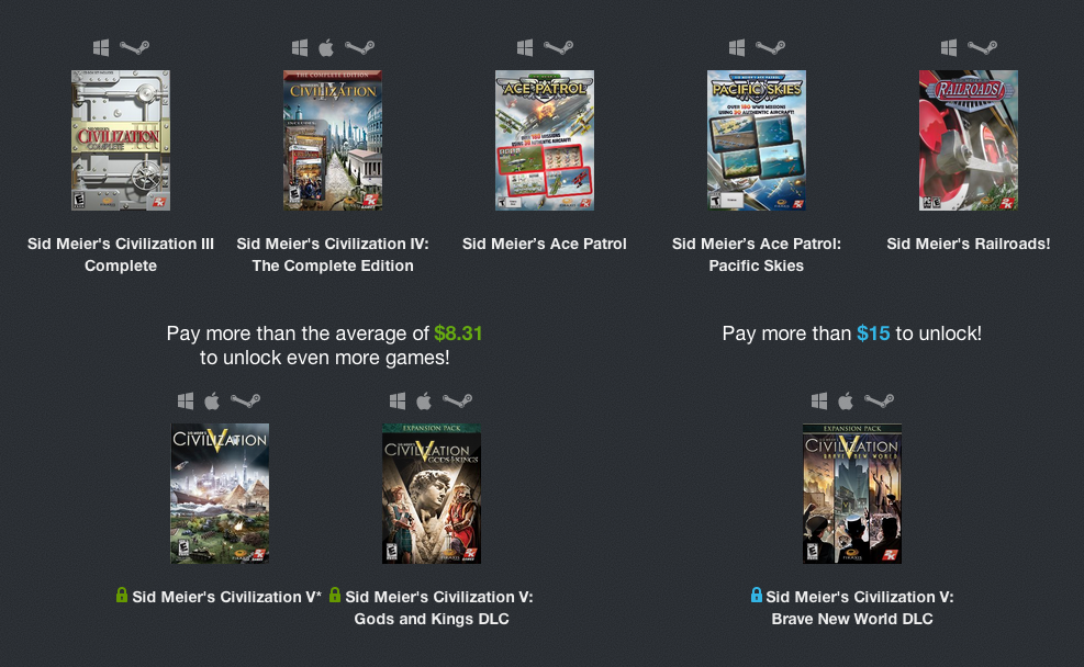 Wer mindestens einen US-Dollar bezahlt, der erhält das Strategiespiel „Civilization 4“ in der Complete-Edition sowie dessen Vorgänger und die Wirtschaftssimulation „Railroads“ mit dazu. Auch zwei Ableger von „Ace Patrol“ sind im Standard-Paket enthalten. Wer mehr als der Durchschnitt bezahlt – aktuell sind das knapp 8,30 US-Dollar – der erhält „Civilization 5“ sowie den DLC „Gods and Knights“ mit dazu. Wer sogar mindestens 15 US-Dollar ausgibt, für den gibt es zusätzlich den DLC „Brave New World“ oben drauf. Jedes der Spiele lässt sich ausschließlich über die Spieleplattform Steam aktivieren und herunterladen. „Civilization V“ und „Civilization IV“ laufen zudem nicht nur unter Microsoft Windows, sondern auch unter Apples Mac-OS-X-Betriebssystem.