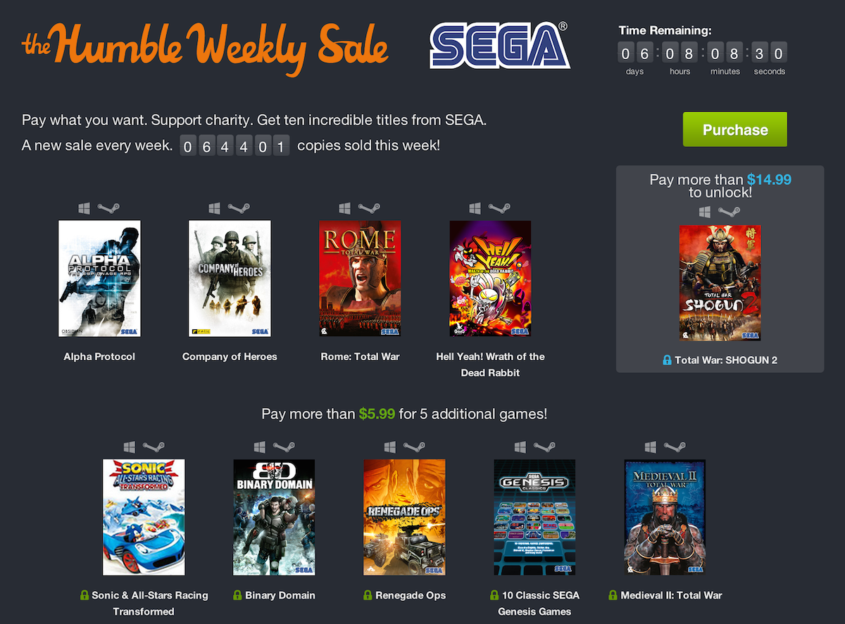 Das Grundpaket hält dabei nicht nur die Strategiespiel-Kracher „Company of Heroes“ und „Rome: Total War“, sondern auch „Hell Yeah! Wrath oft he Dead Rabbit“ und „Alpha Protocol“ bereit. Beträgt die Kaufsumme mehr als 5,99 US-Dollar gibt es eine Reihe weiterer Sega-Spiele obendrauf. Dann erhält der Käufer auch „Sonic & All-Stars Racing Transformed“, Binary Domain“, „Renegade Ops“, „Medival II: Total War“ und eine kleine Spielesammlung der Sega-Genesis-Reihe, die insgesamt zehn Titel umfasst.