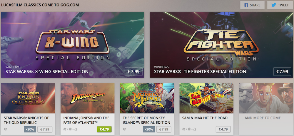 Den Start machen bekannte „Star Wars“-Titel wie „X-Wing“ oder „TIE Fighter“, die 1993 und 1994 erstmals veröffentlicht wurden und nun ihr Comeback feiern dürfen. Die beiden Download-Titel kosten jeweils knapp acht Euro und sind ausschließlich über GOG.com (Good Old Games) erhältlich. Die beiden Special-Editions der Spiele können zudem mit einer geringfügig besseren Auflösung und einem verbesserten Sound auf sich aufmerksam machen, enthalten aber auch sämtliche Erweiterungen. Abgerundet wird das neue Angebot vom Rollenspiel „Star Wars: Knights of the old Repubilc“ oder den beiden Adventure-Hits „Sam & Max hit the Road“ und „The Secret of Monkey Island: Special Edition“. Ebenfalls mit dabei ist „Indiana Jones and the Fate of Atlantis“. Zum Auftakt gibt es 20 Titel – weitere sollen von Zeit zu Zeit folgen.