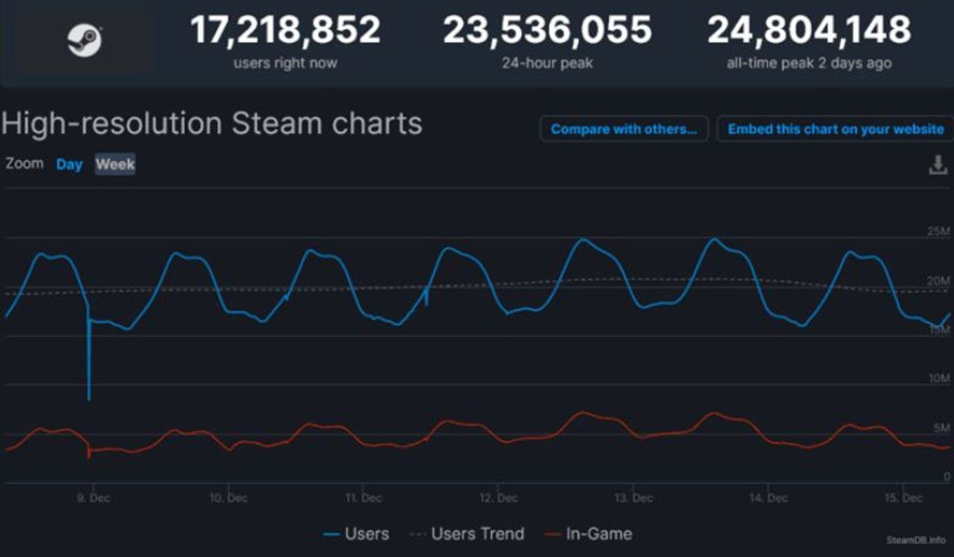 Mit 24.805.106 zeitgleich angemeldeten Benutzern konnte der Spiele-Dienst seinen bisherigen Rekord vom März, bei dem etwas mehr als 20 Millionen Menschen gleichzeitig Online waren, nochmals um knappe 4,8 Millionen Nutzer überbieten. Sicherlich trugen die kürzlichen Herbst- und Winter-Sales sowie das Erscheinen des lang erwarteten Shooter-Rollenspiels Cyberpunk 2077 dazu bei dass das Interesse an der Spiele-Plattform derzeit so hoch ist. Ebenso maßgeblich daran beteiligt waren aber auch Spiele wie Apex Legends das mittlerweile auch auf Steam verfügbar ist, PUBG und CS:GO.